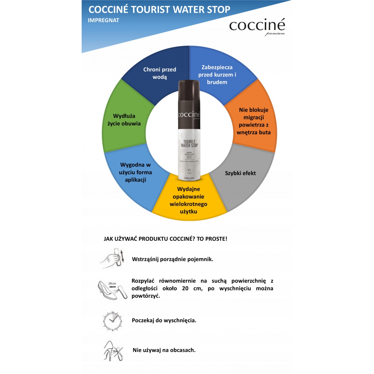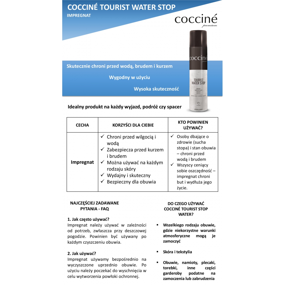 Preparat polecany do każdego rodzaju obuwia, w tym skórzanego, zamszowego, namiotów, parasolek, obuwia i odzieży sportowej.