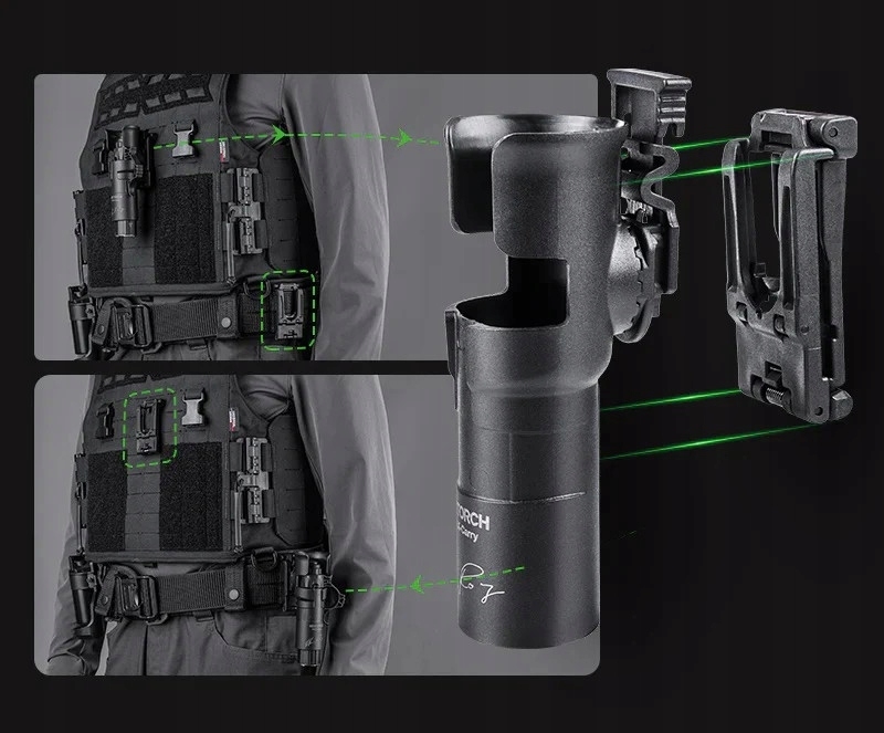 Uchwyt mocowany jest na pas, a dzięki regulacji można dopasować go do różnych szerokości pasów taktycznych. Jest kompatybilny z systemem MOLLE, co pozwala na płynną zmianę miejsca montażu.