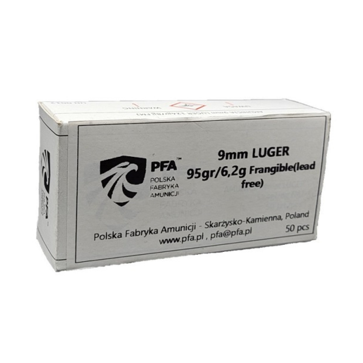AMUNICJA 9x19 PFA 6,2g 95gr, PROSZKOWA BEZOŁOWIOWA ANTYRYKOSZETUJĄCA opakowanie 50szt.