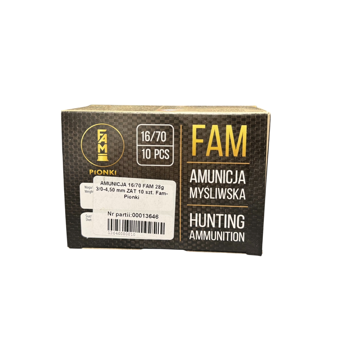 FAM Pionki 16/70 28 g 3/0-4,5 mm to amunicja śrutowa do strzelb gładkolufowych o kalibrze 16/70, przeznaczona do strzelania śrutem o średnicy 4,5 mm. Nabój ten oferuje uniwersalną charakterystykę pracy – łączy dobrą koncentrację śrutu z umiarkowanym odrzutem. Produkowany przez FAM Pionki, cenionego polskiego producenta amunicji.