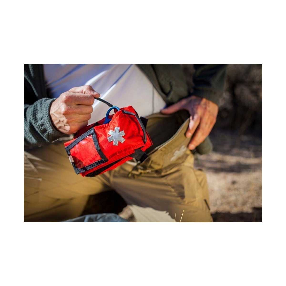 Uniwersalną kieszeń medyczną można mocować na pasku, platformie MOLLE/PALS lub przenosić na dołączonej taśmie nośnej jako torbę biodrową (tzw. nerkę). W jej wnętrzu znajduje się mocowany na rzep Velcro®, łatwo wyjmowany wkład Universal Med Insert®.