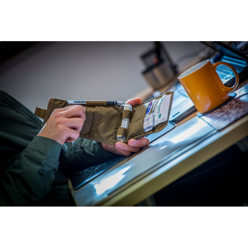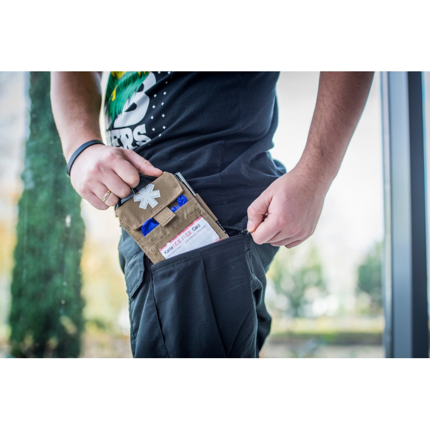 Kieszeniowy Wkład Medyczny to niewielka apteczka w formie zapinanego na rzep portfela, która mieści się w kieszeni spodni. Wykonany został z wytrzymałego materiału Cordura®. Z przodu znajduje się transparentne okienko na kartę I.C.E./procedury oraz kieszeń na rękawiczki. Z tyłu natomiast jest kieszeń na nożyczki. Do przenoszenia apteczki służy antypoślizgowy, gumowany uchwyt. Wewnętrzne kieszenie, jaki i elastyczne pętle pozwalają na przemyślane ułożenie podstawowych środków pierwszej pomocy.