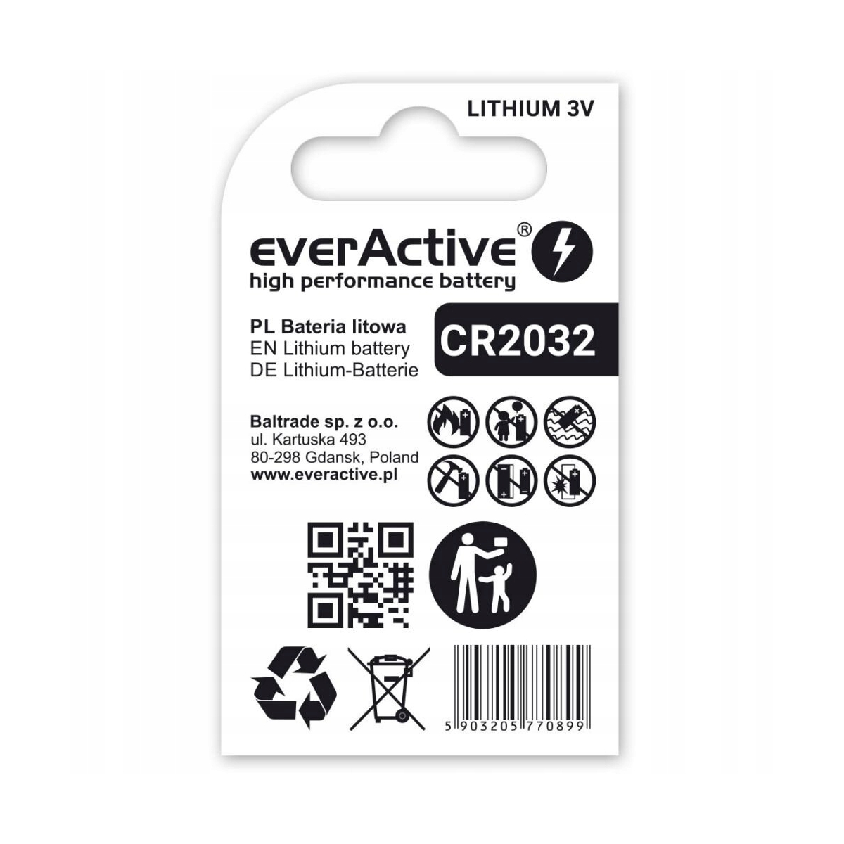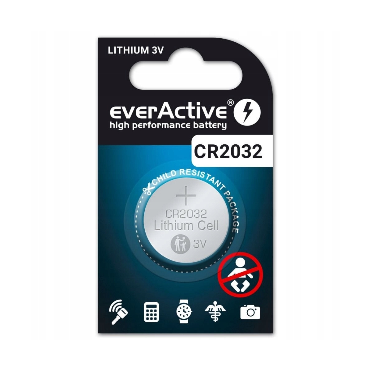 Bateria Litowa EverActive CR2032 - o pojemności 225 mAh i napięciu 3V. Opakowanie zawiera 1 sztukę.