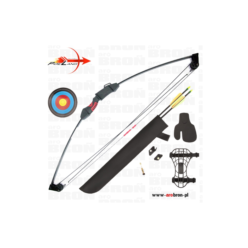 W zestawie: 2 strzały, kołczan, ochraniacz przedramienia, celownik, tarcza, skórka na palce, podstawka pod strzałę.