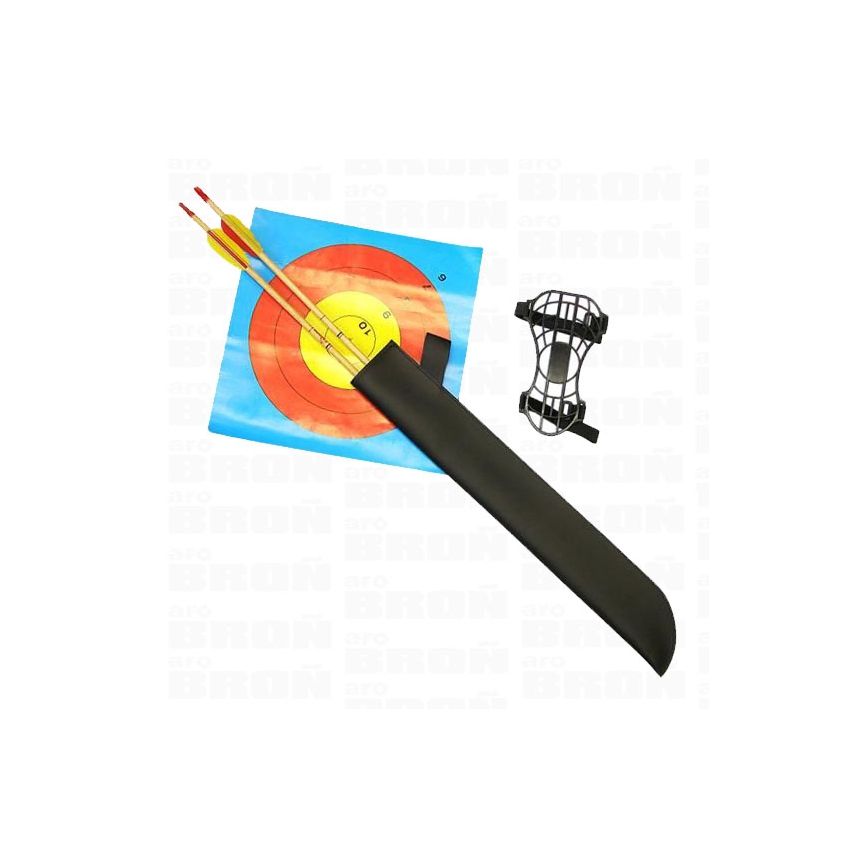 Zestaw zawiera: łuk, tarczę łuczniczą, dwie drewniane strzały, kołczan, ochraniacz na przedramię.