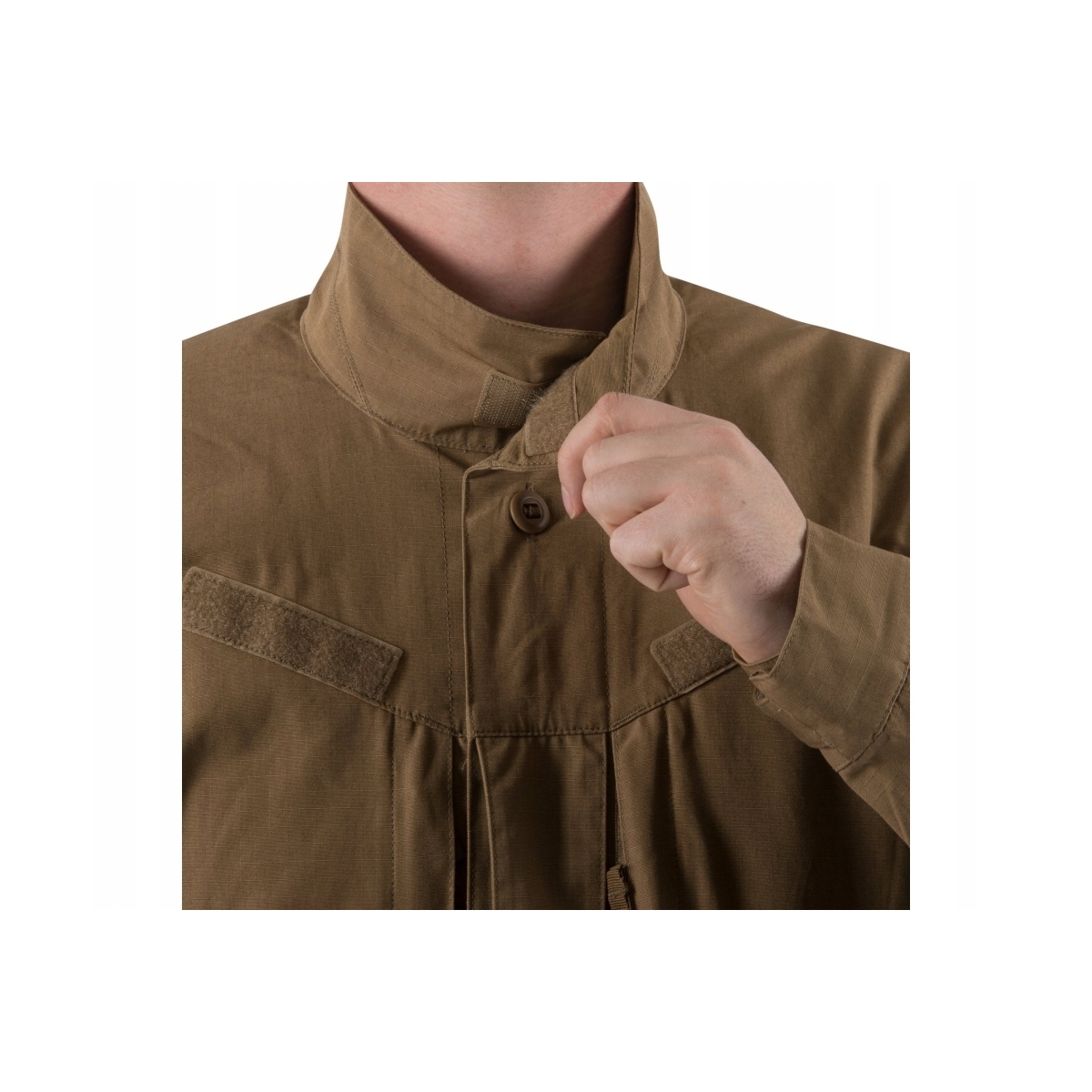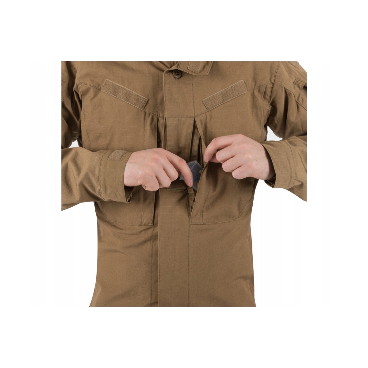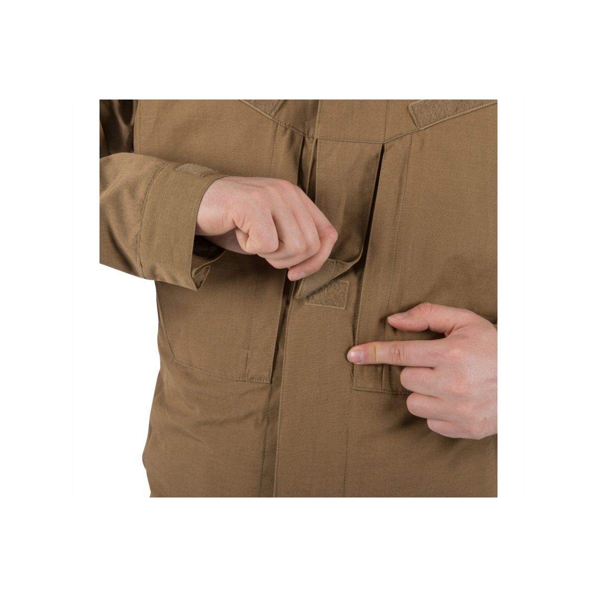 Bluza ma profilowany, dopasowany krój z bocznymi wstawkami z tkaniny VersaStretch®. Klasyczny kołnierzyk można postawić, a następnie zapiąć rzepami. Na wysokości klatki piersiowej znajdują się dwie zapinane na zamek kieszenie, nad którymi umieszczone zostały miękkie panele Velcro na naszywki. Dodatkowo centralnie z przodu znajduje się pagon na stopień wojskowy.