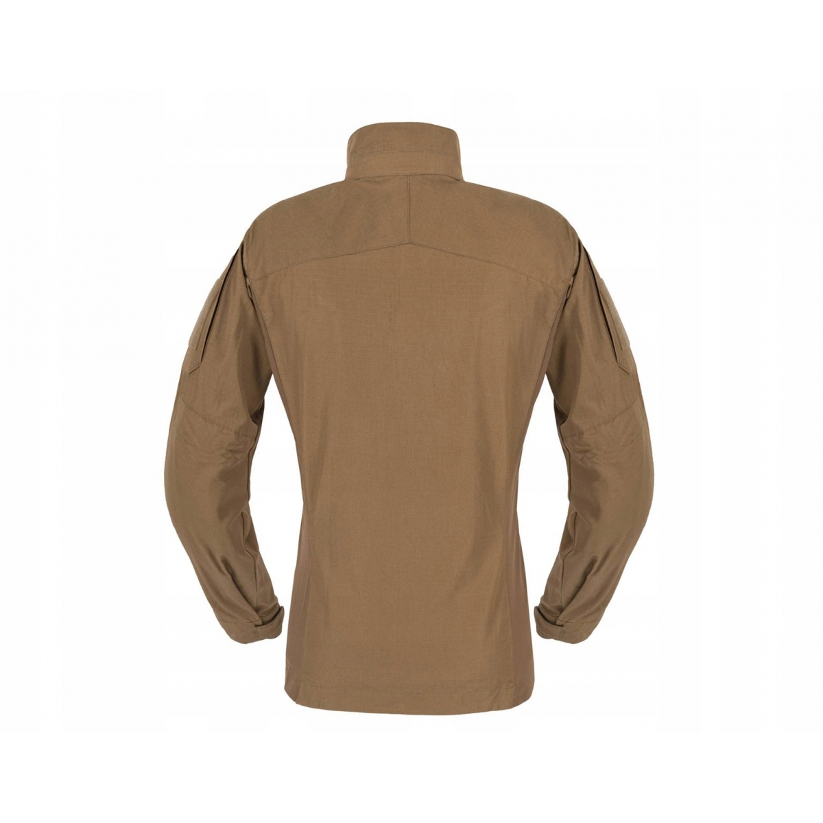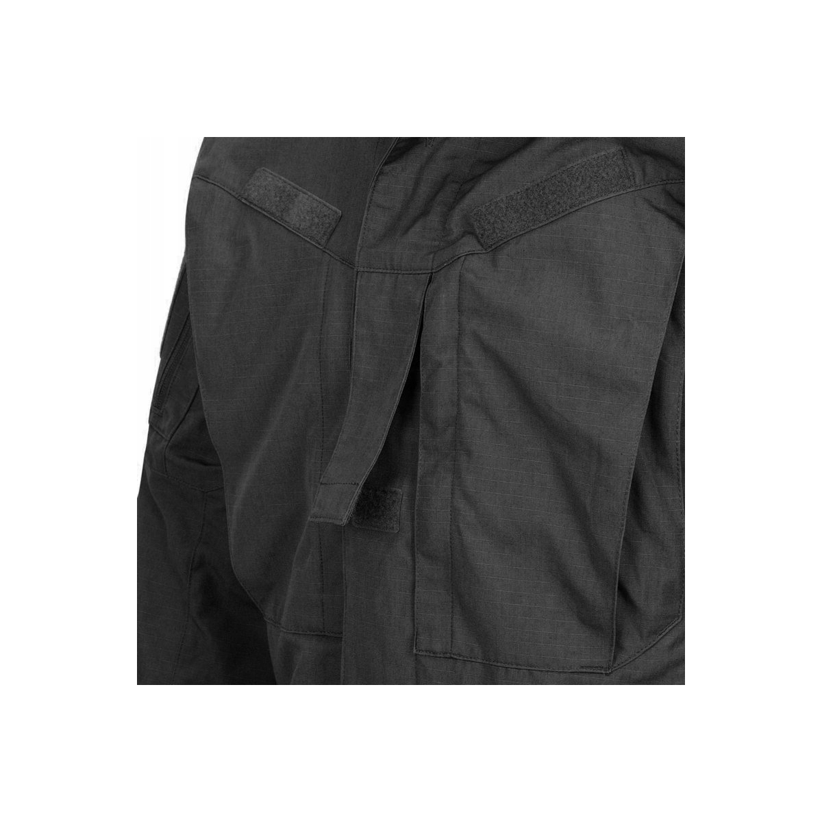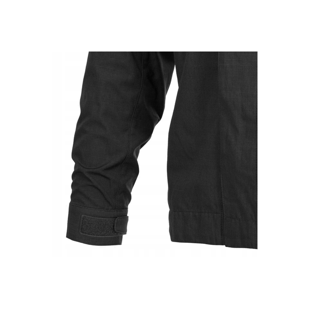 Bluza ma profilowany, dopasowany krój z bocznymi wstawkami z tkaniny VersaStretch®. Klasyczny kołnierzyk można postawić, a następnie zapiąć rzepami. Na wysokości klatki piersiowej znajdują się dwie zapinane na zamek kieszenie, nad którymi umieszczone zostały miękkie panele Velcro na naszywki. Dodatkowo centralnie z przodu znajduje się pagon na stopień wojskowy.