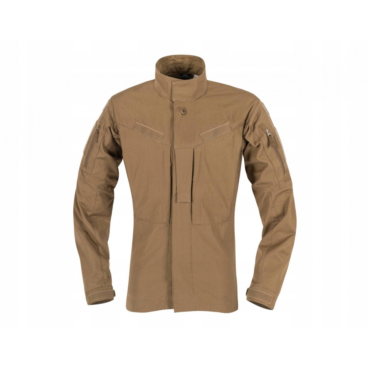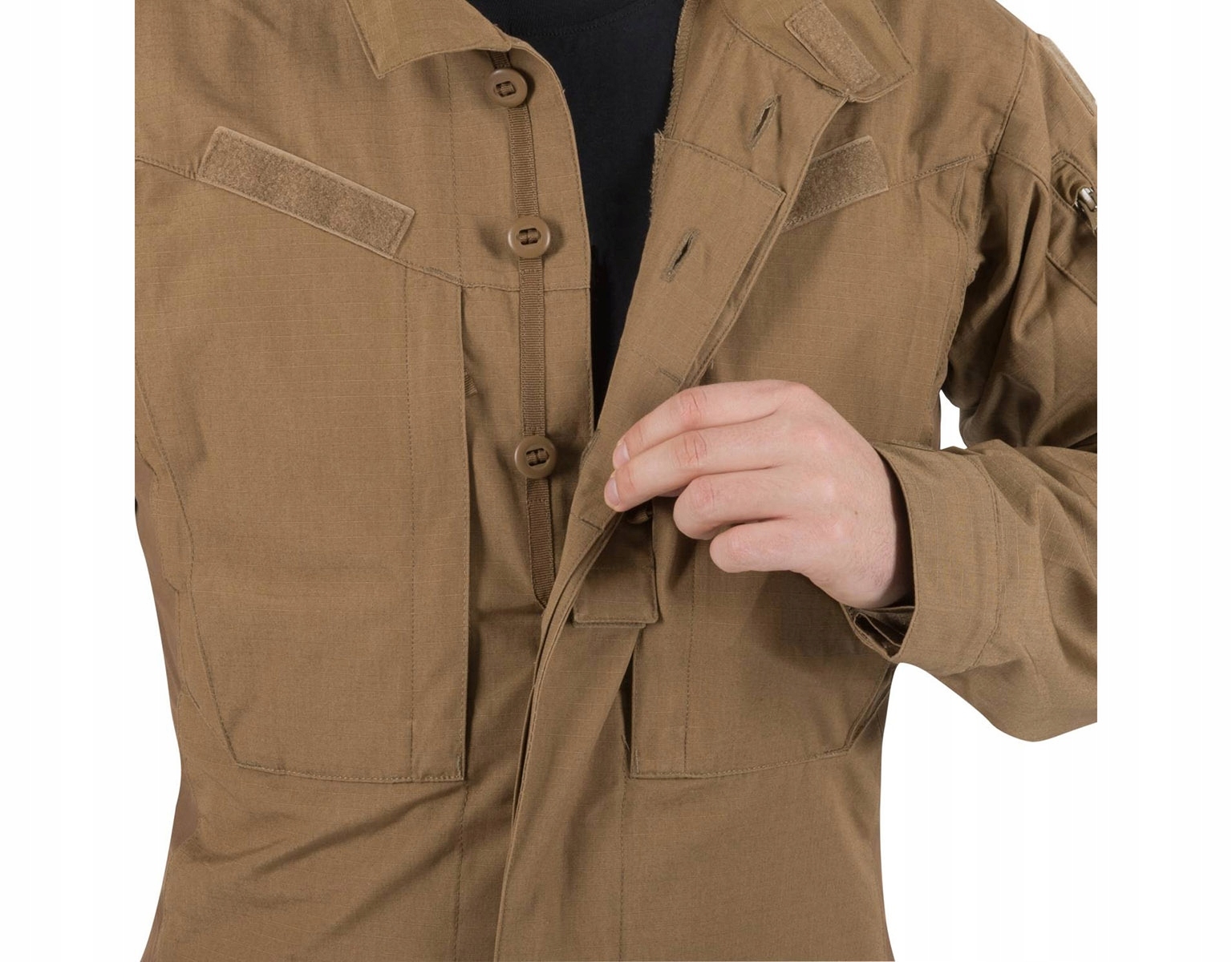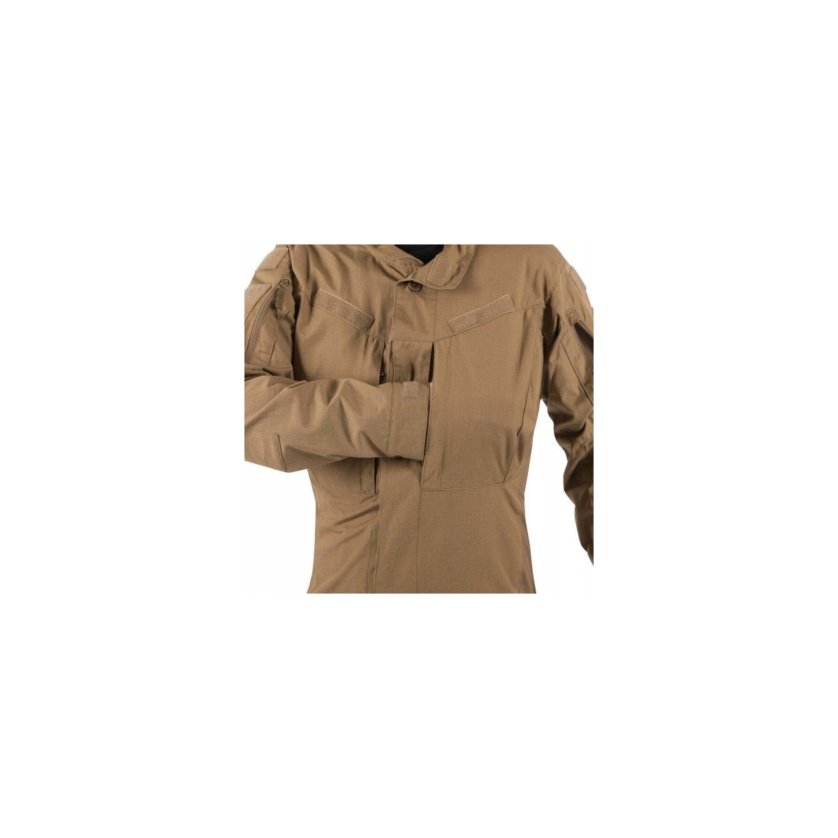 Bluza ma profilowany, dopasowany krój z bocznymi wstawkami z tkaniny VersaStretch®. Klasyczny kołnierzyk można postawić, a następnie zapiąć rzepami. Na wysokości klatki piersiowej znajdują się dwie zapinane na zamek kieszenie, nad którymi umieszczone zostały miękkie panele Velcro na naszywki. Dodatkowo centralnie z przodu znajduje się pagon na stopień wojskowy.