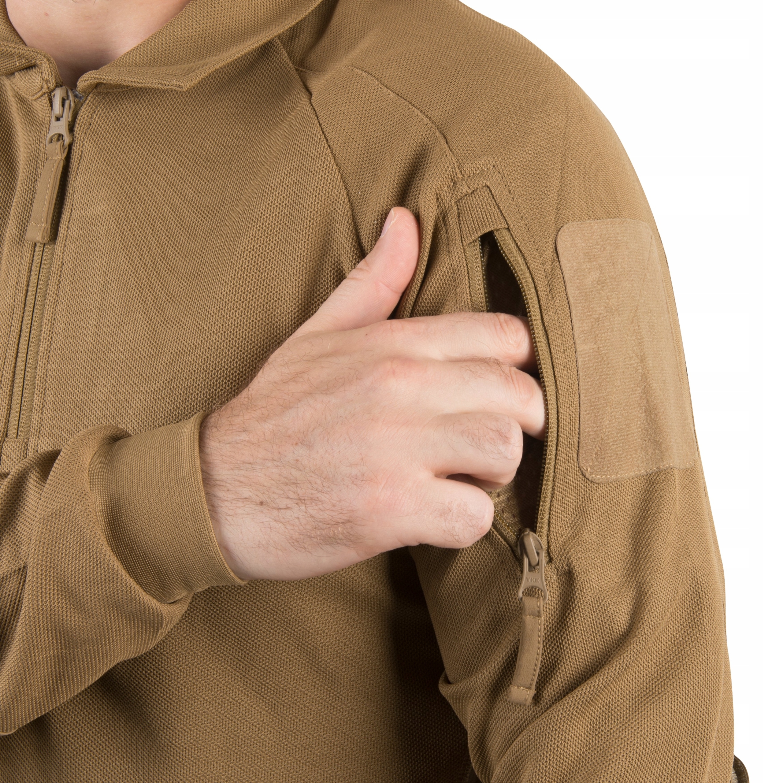 Panele rzepowe na ramionach pozwalają na łatwą personalizację. Dodatkowo koszulka ma dwie naramienne kieszenie i pętlę na okulary.