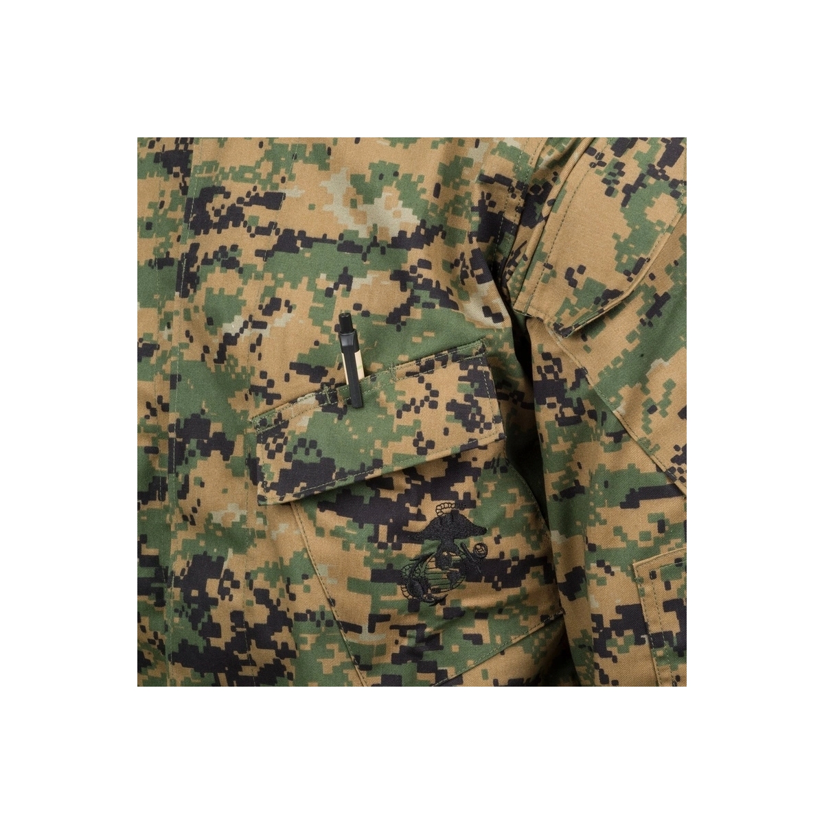 - Haftowane logo USMC: Na lewej kieszeni piersiowej znajduje się charakterystyczny emblemat „Eagle, Globe and Anchor” (EGA), podkreślający autentyczność wzoru.