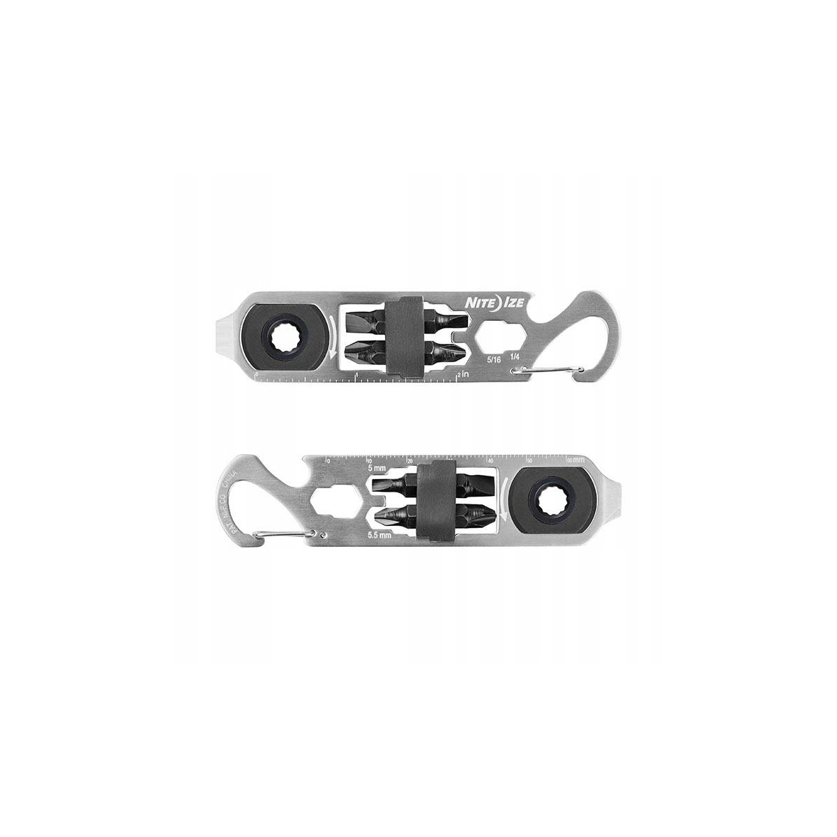 Nite Ize - Brelok Microtool KMTRT-11-R3 - model wyposażony w zestaw potrzebnych narzędzi. Wykonany w całości ze stali nierdzewnej w naturalnym kolorze. Pozwoli naprawić usterki, będąc w podróży. Klucz z grzechotką pozwala w wygodny sposób odkręcać śruby płaski i krzyżakowe.