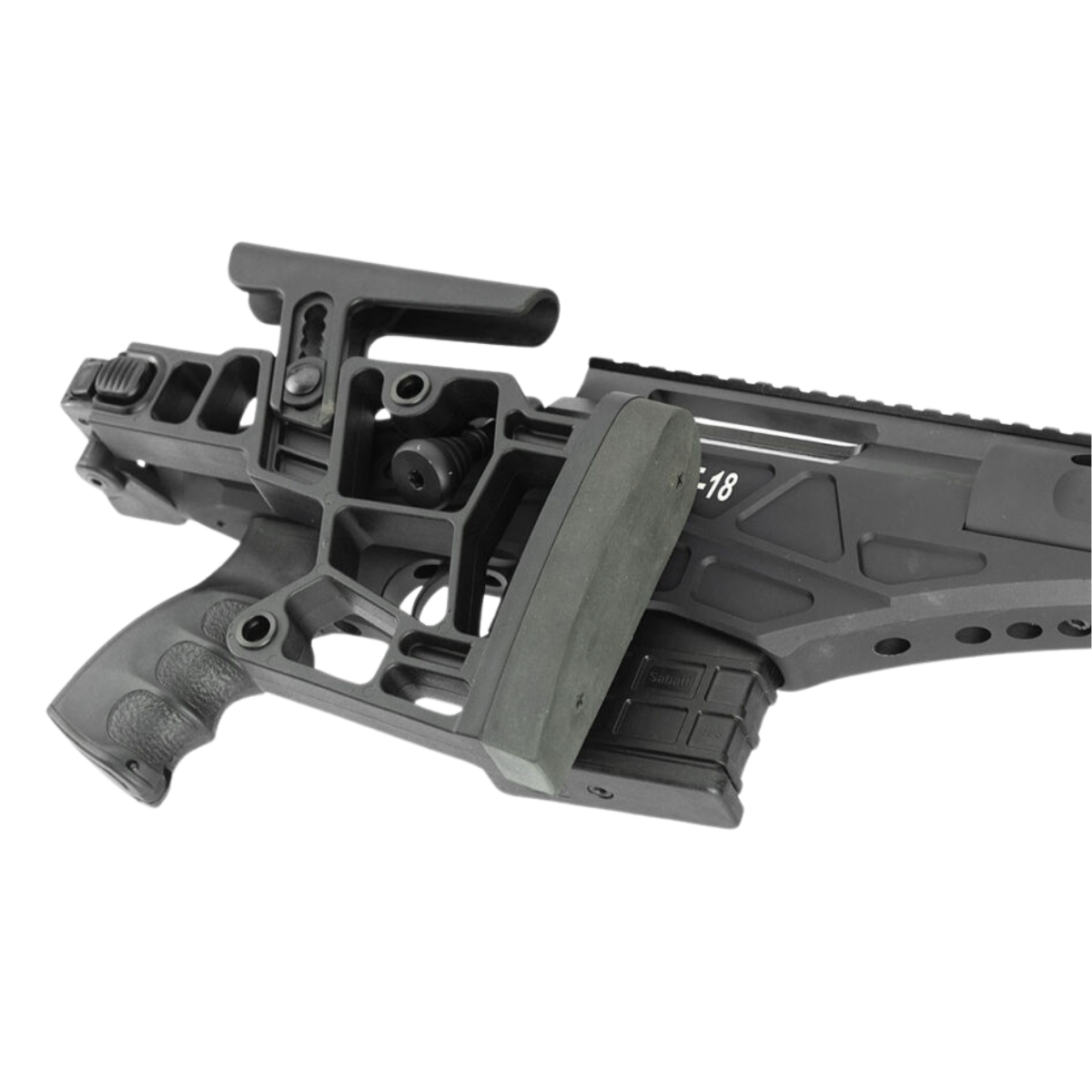 Kolba polimerowa jest składana na bok, co ułatwia transport i przechowywanie, a także w pełni regulowana, pozwalając na dostosowanie do indywidualnych potrzeb strzelca. Na górnej części chassis znajduje się szyna Picatinny o nachyleniu 15 MOA, umożliwiająca montaż optyki, natomiast łoże wyposażone jest w system M-LOK, pozwalający na instalację dodatkowych akcesoriów.