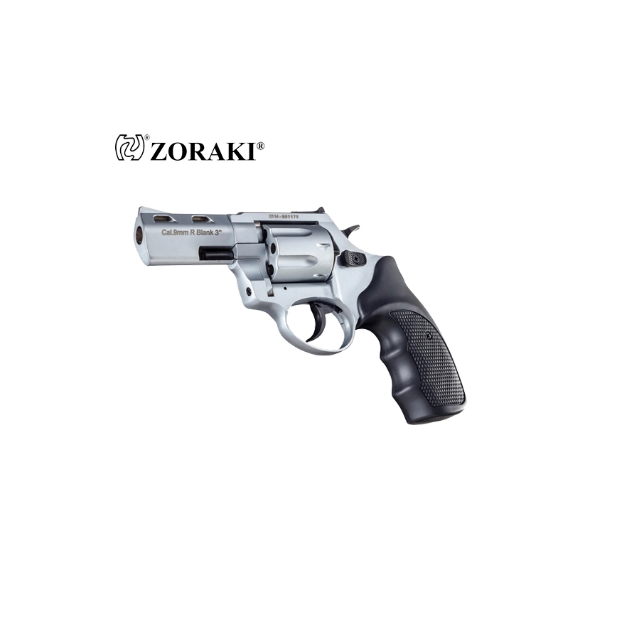Rewolwer ZORAKI alarmowy hukowy R2-3" Matte Chrome to model słynący z niezawodności na amunicję hukową green 6mm. Wykonany został w całości z wysokiej jakości metalu, natomiast okładziny rękojeści z tworzywa sztucznego. Bębenek mieści w sobie 9 sztuk nabojów. Rewolwer oddaje strzały w dwóch trybach: single action oraz double action. Można więc oddawać strzały naciskając od razu spust lub wcześniej odciągając kurek. Do usunięcia łusek służy wyrzutnik łusek (ejector). Rewolwer posiada przyrządy celownicze muszkę i szczerbinkę. W komplecie dołączona została nasadka do rac, co sprawia, że rewolwer może służyć nie tylko jako straszak przeciwko napastnikom czy zwierzętom, ale również może uświetnić wydarzenia okolicznościowe.