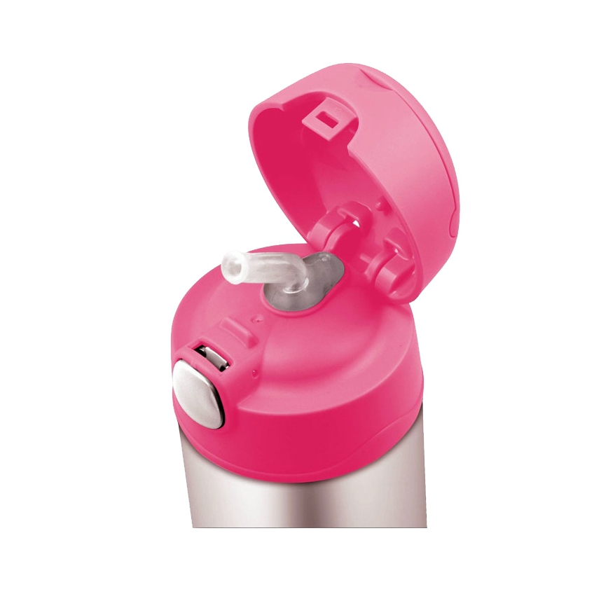 Specjalnie zaprojektowana zakrętka pozwala na bezpiecznie użytkowanie przez dzieci bez ryzyka wylania czy oblania się napojem. Otwarcie nakrętki odbywa się za pomocą przycisku, pod którą kryje się ustnik słomki.
