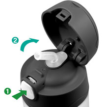 - Otwarcie nakrętki odbywa się za pomocą przycisku, pod która kryje się ustnik słomki.