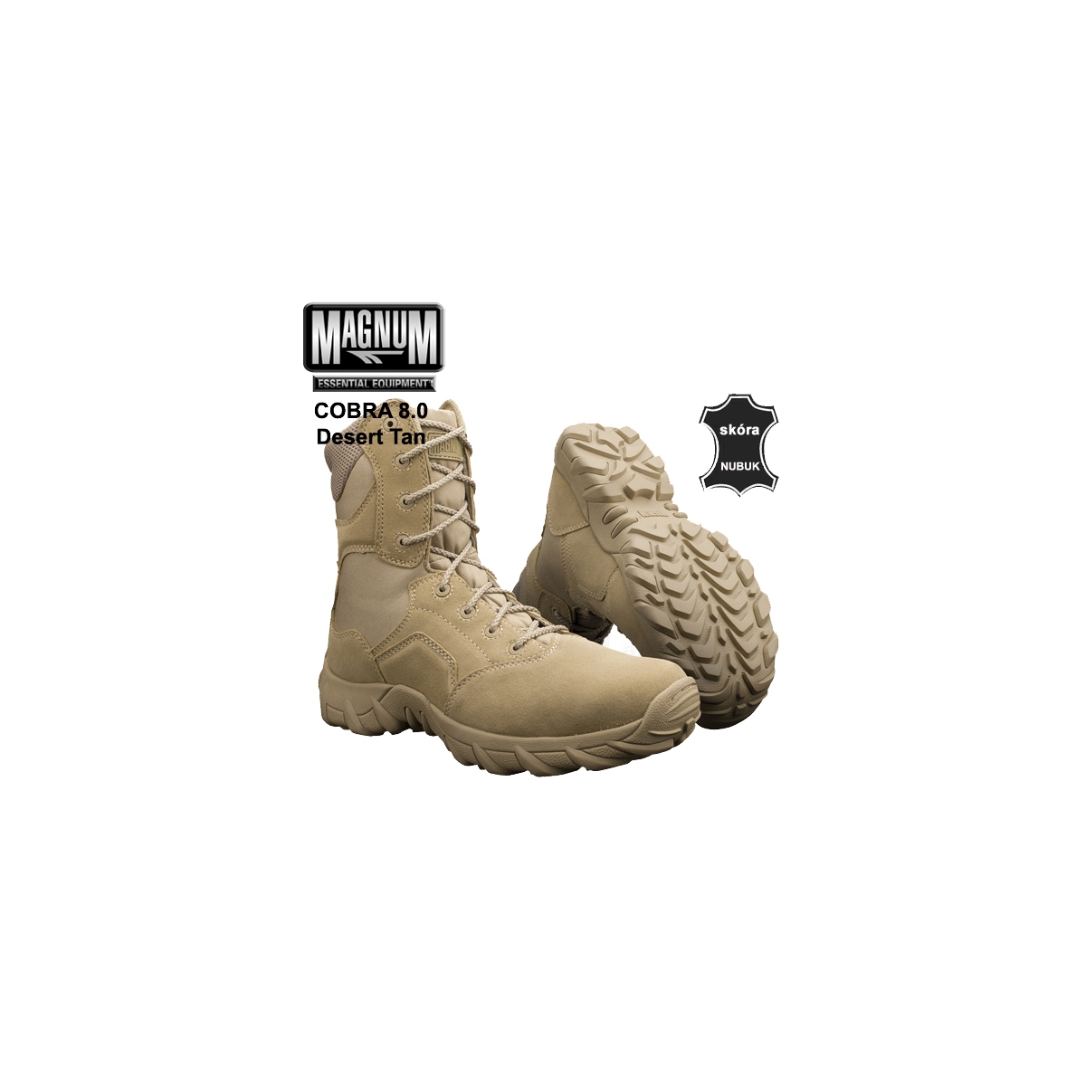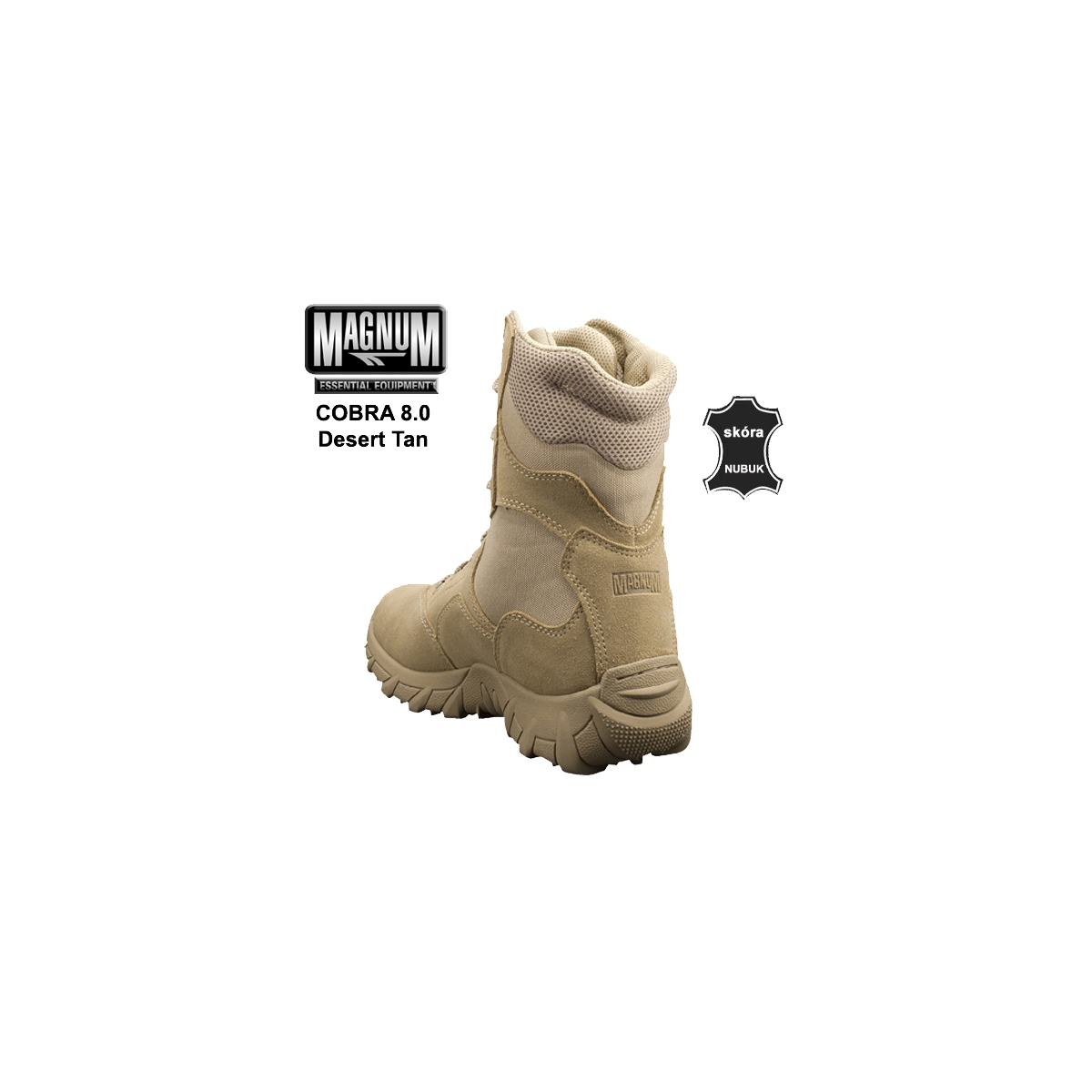 Buty MAGNUM Cobra 8.0 DESERT TAN - to jeden z najpopularniejszych modeli angielskiego producenta Magnum w wersji kolorystycznej pustynnej. Obuwie zaprojektowane z myślą o policji, służbach ochrony i entuzjastach airsoft-u czy paintball-u. Lekkie, wygodne i niezwykle funkcjonalne buty sprawdzą się podczas akcji, a także w mieście. Wysokie (8 cali - ok. 20cm), zakrywające kostkę, solidnie wykonane - z wodoodpornej skóry Nubuk oraz nylonu balistycznego o splocie 900 D. Posiadają certyfikat europejski EN ISO 20347:2004.