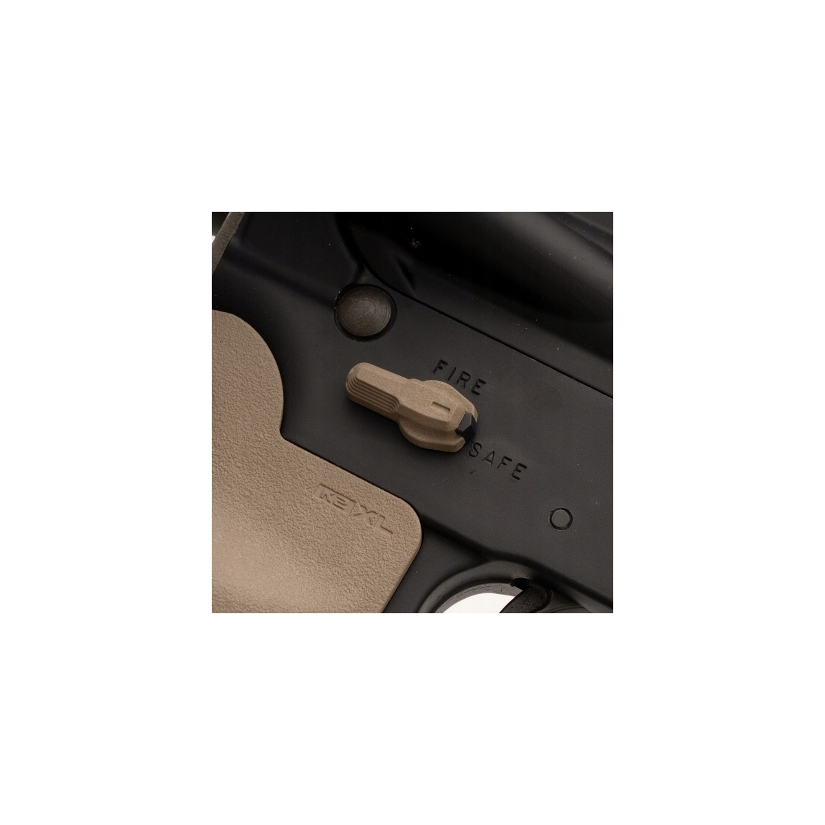 Zestaw selektorów ognia do broni z platformy AR, wykonany z wytrzymałego polimeru i stali. Obustronny selektor pozwala na dostosowanie karabinka do osób leworęcznych lub chcących używać manipulatorów z dwóch stron oraz montaż pod kątem 60 st. i 90 st.