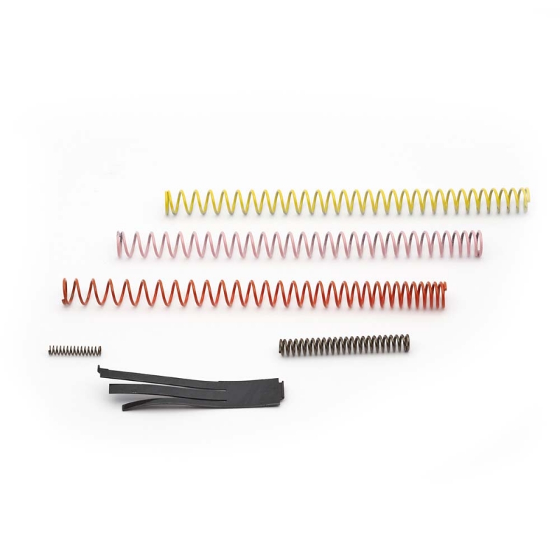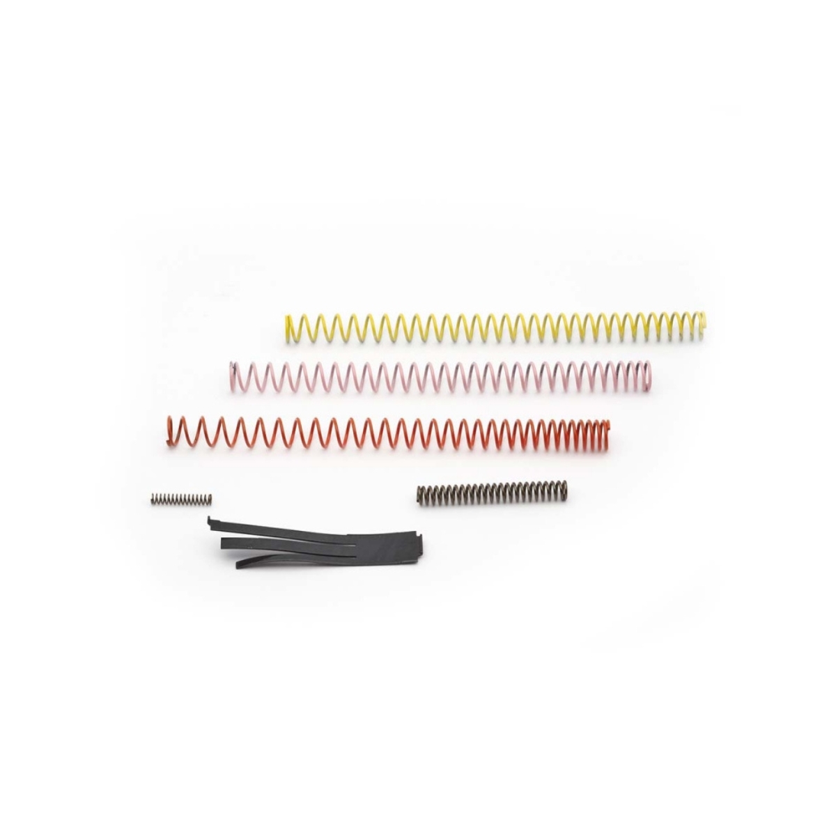Sprężyny zawarte w zestawie charakteryzują się stałą charakterystyką pracy i wysoką odpornością na zmęczenie materiału. Dzięki zastosowaniu specjalnych stopów stali, każda sprężyna zachowuje swoje właściwości nawet przy bardzo intensywnym użytkowaniu w strzelectwie dynamicznym. Zestaw pozwala na obniżenie siły nacisku na spust, zachowując jednocześnie pełne bezpieczeństwo i niezawodność zbicia spłonki.