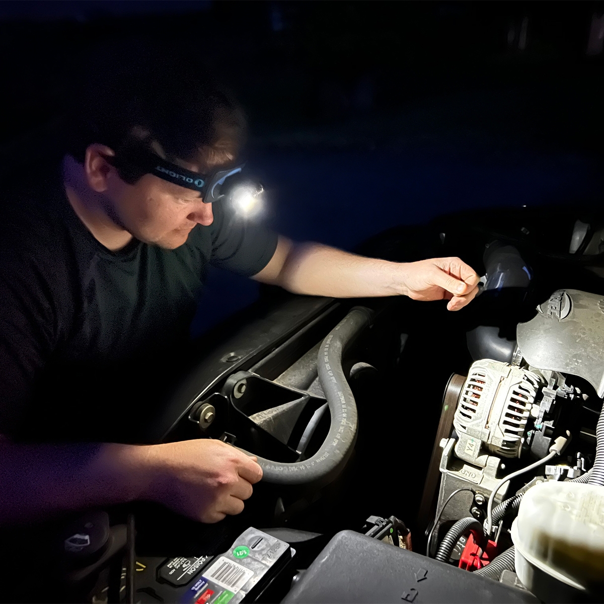 - Opaska na głowę z silikonowym uchwytem, daje możliwość przekształcenia latarki z kątowej w czołową i odwrotnie.