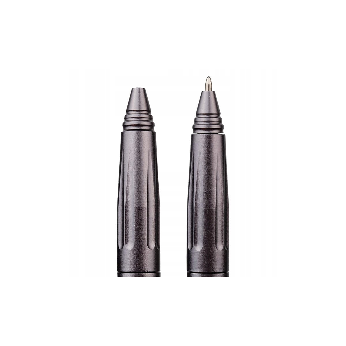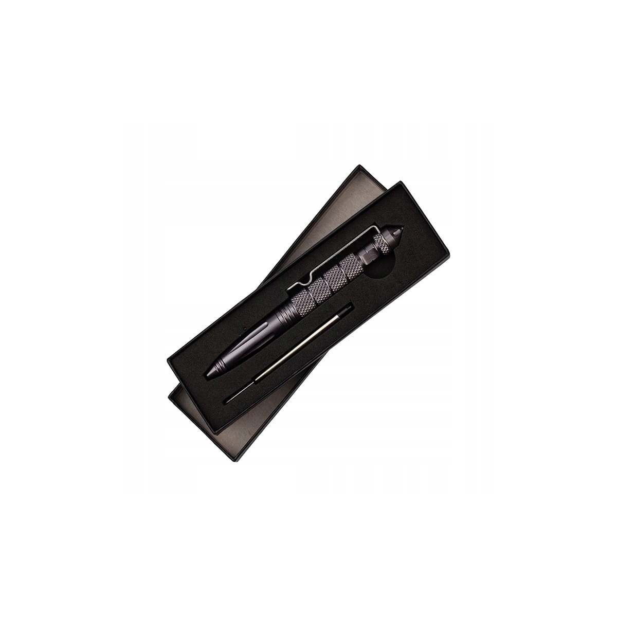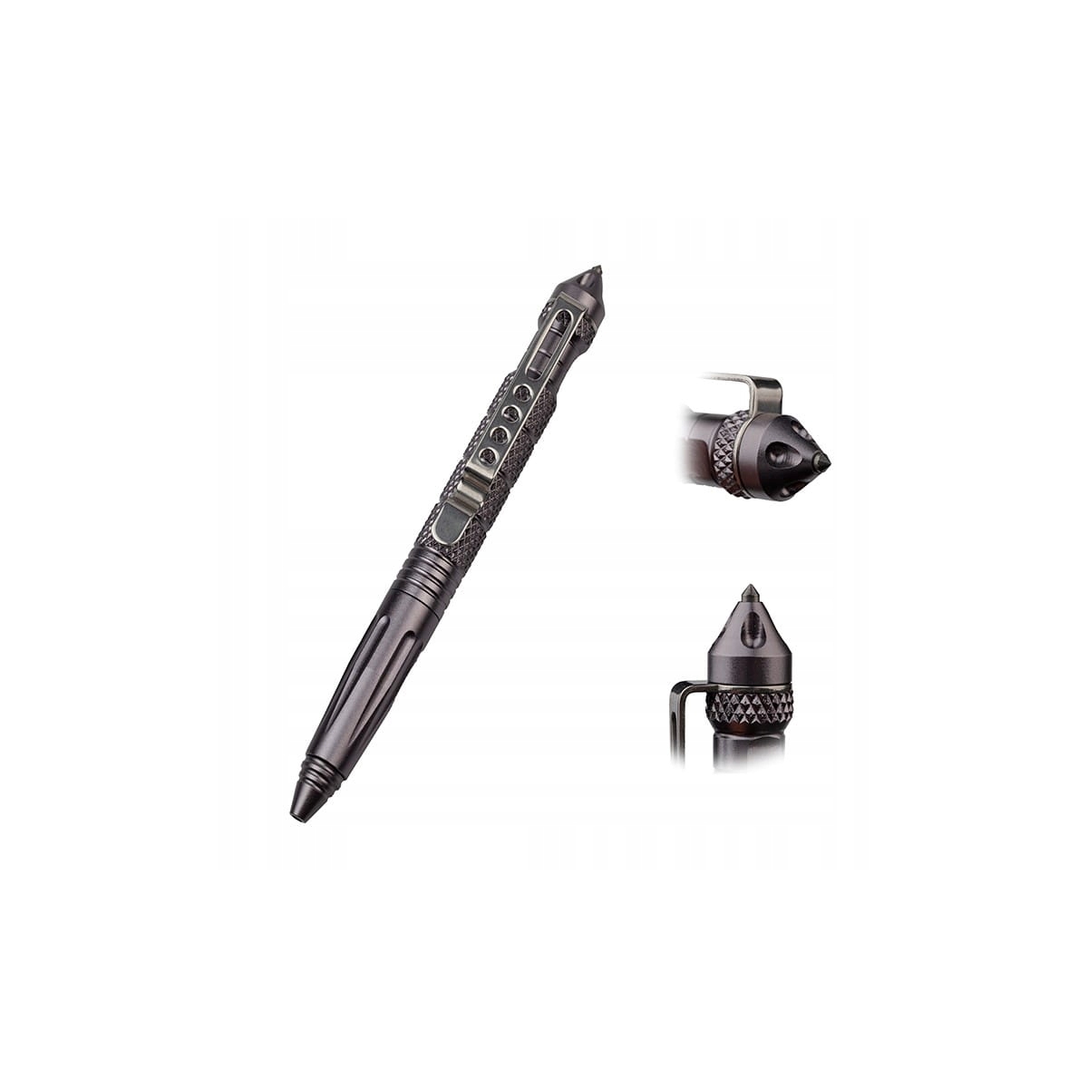 Długopis wyposażony został w zbijak do szyb, który również pełni funkcję kubotanu do samoobrony. Dodatkowo sprężysty metalowy klips zadba o wygodę codziennego przenoszenia. Dzięki stopowi aluminium długopis jest lekki a jego waga wynosi zaledwie 45g.