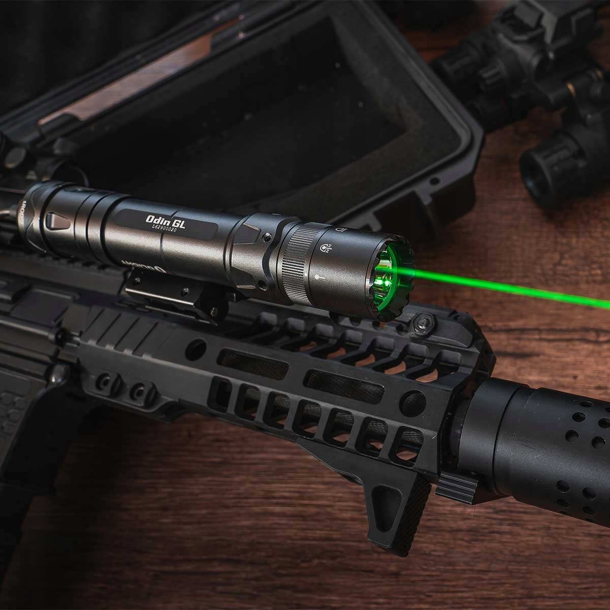 W latarce zastosowano zielony laser o mocy <5mW, który ułatwia szybkie namierzenie celu bez konieczności zgrywania muszki ze szczerbinką. W zestawie z Odin GL znajduje się uchwyt na szynę Picatinny zawierający dwa gniazda i przycisk blokady dla łatwej i bezpiecznej instalacji.