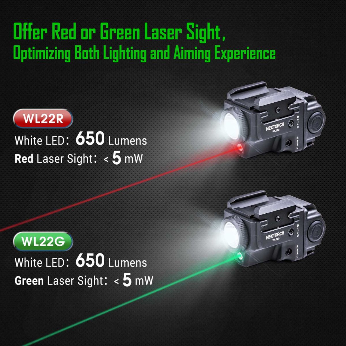 WL22G to kompaktowa latarka z opcją celowania laserowego do zamocowania na broń o mocy do 650 lumenów i zasięgu do 130 metrów. Do wyboru mamy zielony laser zapewniający dobrą widoczność podczas dnia.