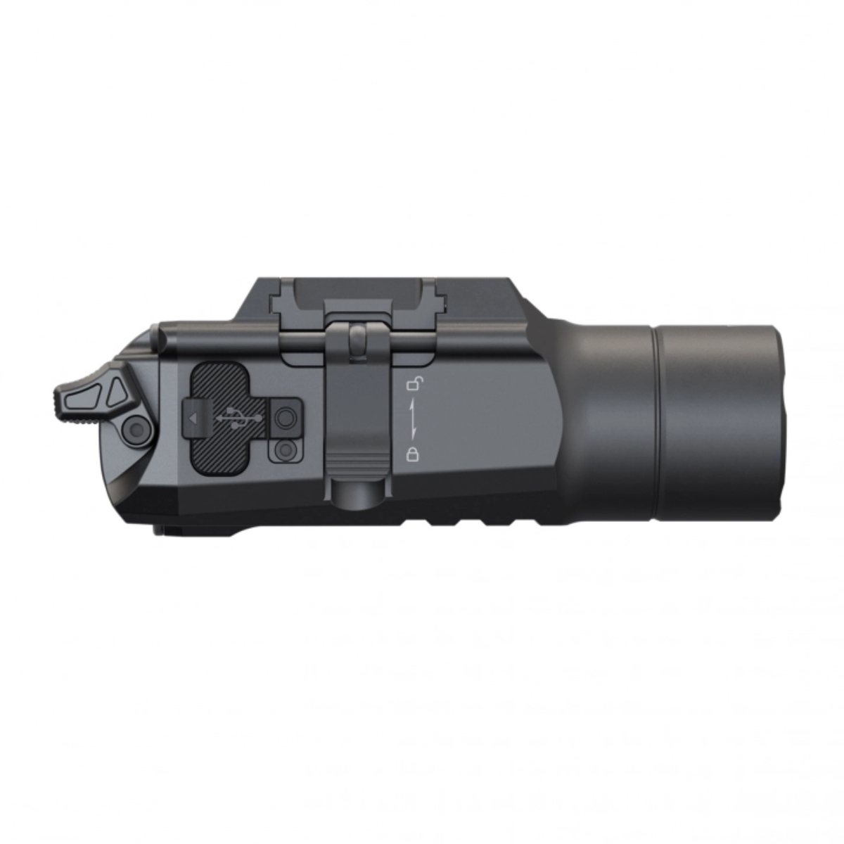 Szybki montaż QD: Dźwignia szybkiego montażu typu Quick Detach pozwala na błyskawiczne zamocowanie lub demontaż latarki na szynach Glock oraz Picatinny.