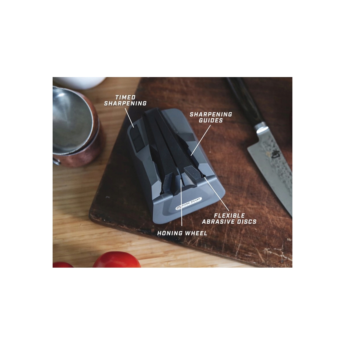 W odróżnieniu od większości ostrzałek kuchennych wykorzystujących płytki diamentowe Work Sharp E2-I zastosował elastyczne tarcze ścierne o gradacji P120, które ostrzą delikatniej, jednak tworzą krawędź ostrza, która ma znacznie wyższą ostrość.