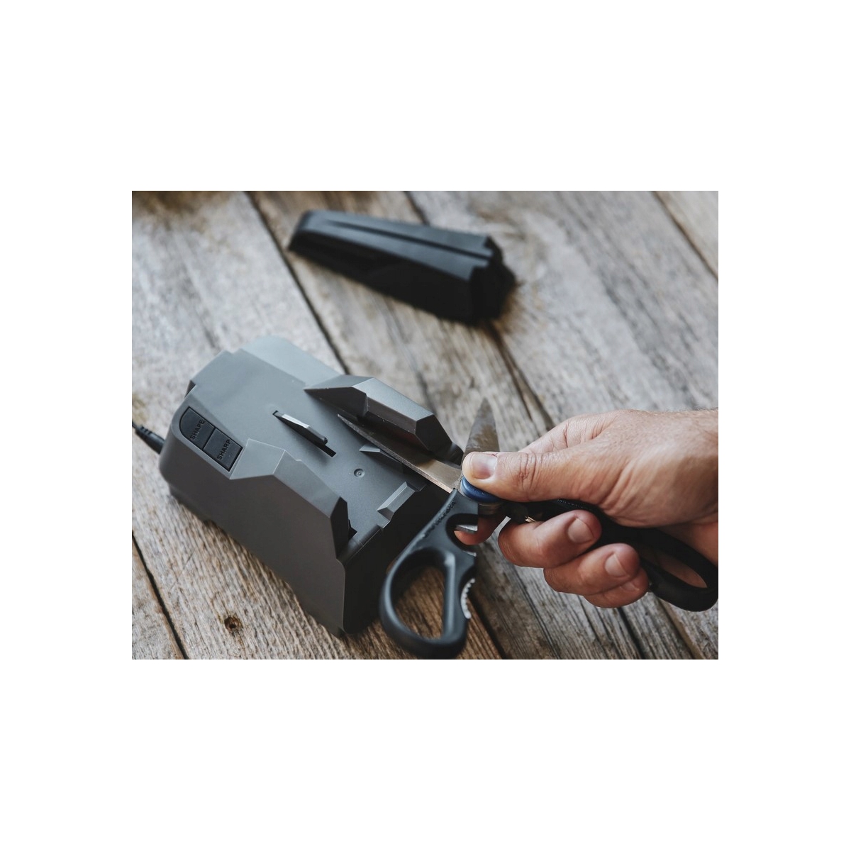 Ostrzałka pozwala również na ostrzenie nożyczek, w tym celu wystarczy zdemontować przystawkę ceramiczną i włączyć ostrzałkę w trybie mniejszej prędkości.