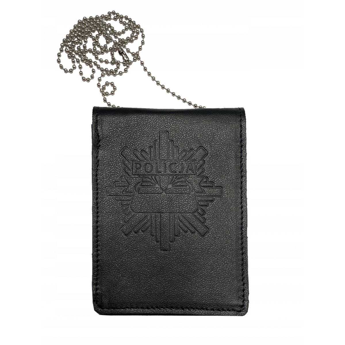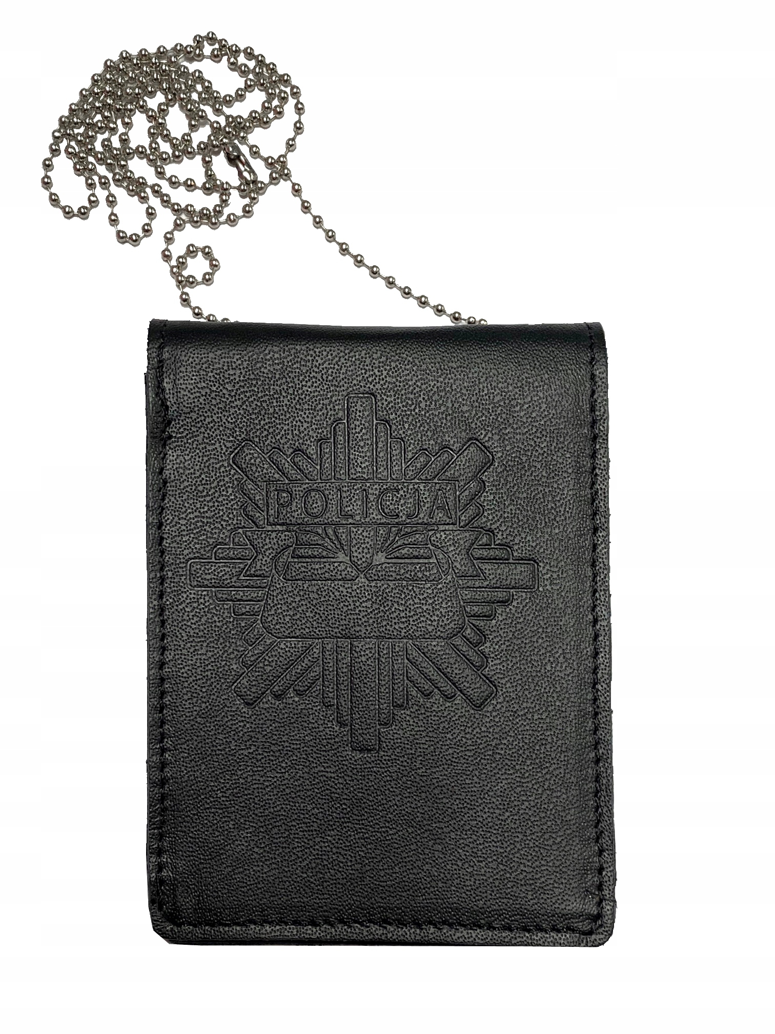 Etui na legitymację odznakę Policyjną - pokrowiec na legitymację i odznakę otwierany, z łańcuszkiem, wykonany z miękkiej skóry. Z wierzchniej strony etui posiada wytłoczenie z wizerunkiem odznaki. Wewnątrz jest miejsce na przypięcie odznaki, przeźroczysta kieszonka na legitymację oraz dodatkowa zakładka na dokumenty. Etui delikatnie usztywnione poprzez poliestrową podszewkę.