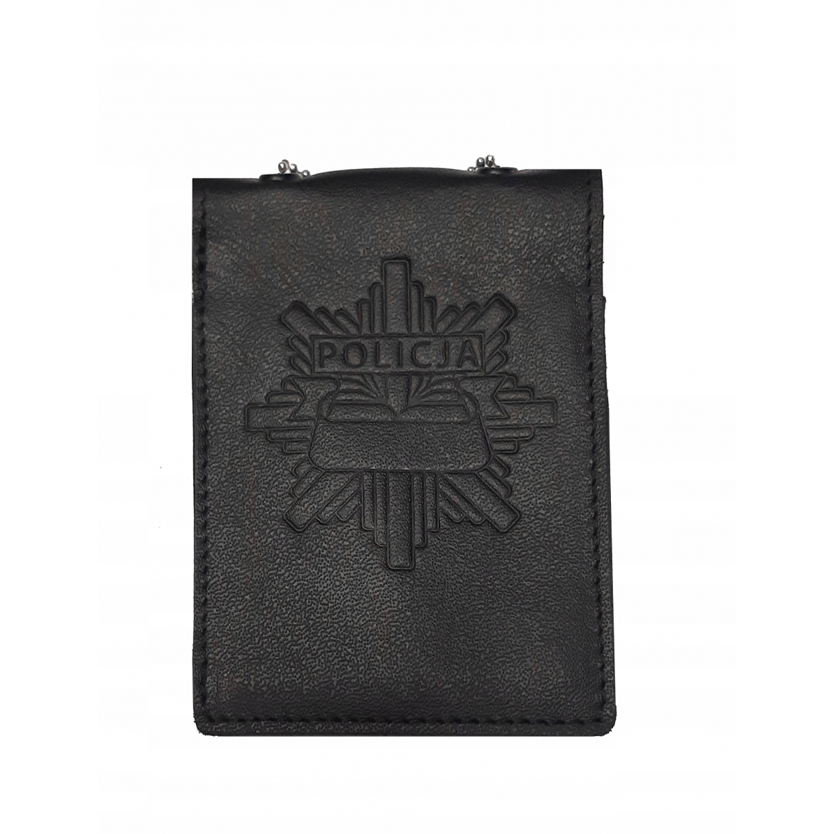 Etui na legitymację odznakę Policyjną - pokrowiec na legitymację i odznakę otwierany, z łańcuszkiem, wykonany z miękkiej skóry. Z wierzchniej strony etui posiada wytłoczenie z wizerunkiem odznaki. Wewnątrz jest miejsce na przypięcie odznaki, przeźroczysta kieszonka na legitymację oraz dodatkowa zakładka na dokumenty.