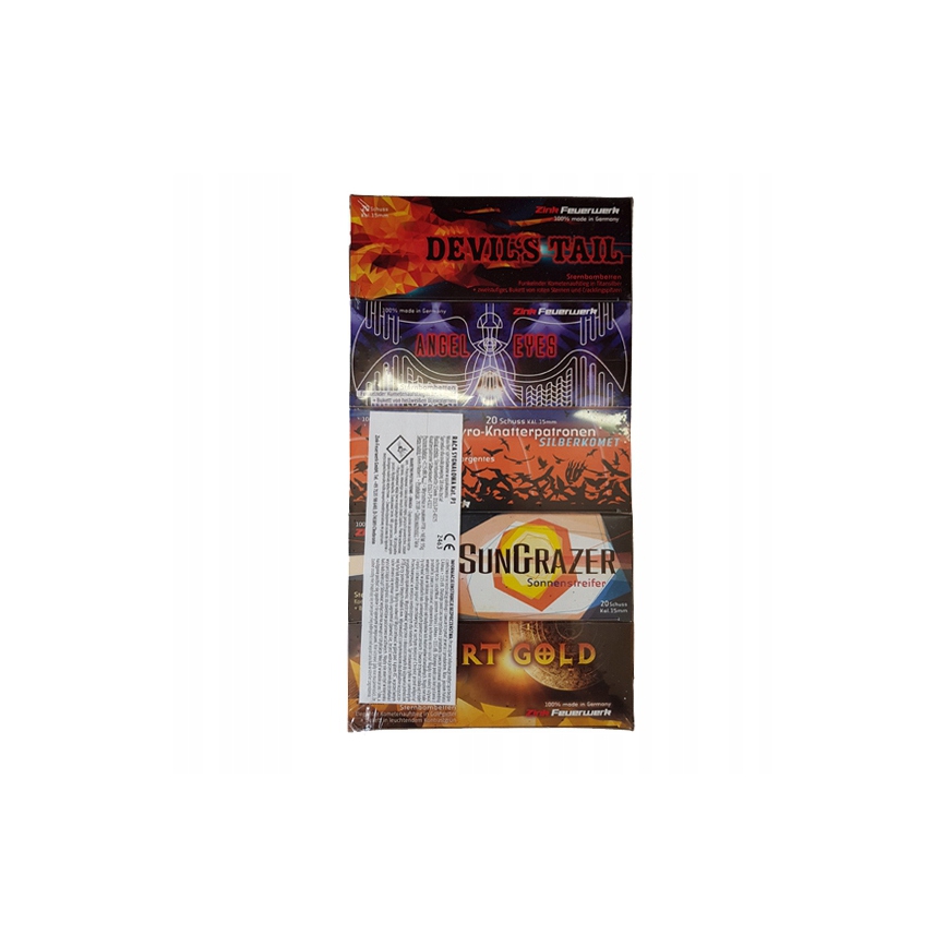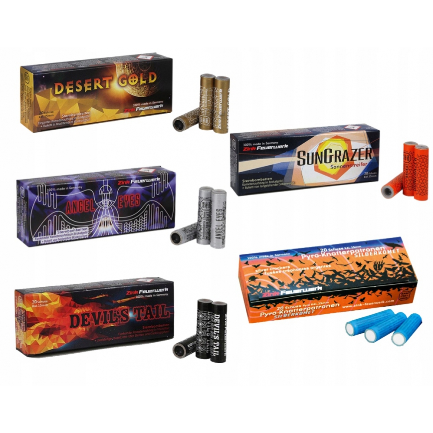 Race Zink Feuerwerk High Five - zestaw 100szt (5 różnych efektów po 20szt z każdego) niemieckiego producenta Zink Feuerwerk. Mogą służyć do odstraszania dzikiej zwierzyny lub do uatrakcyjnienia spotkań towarzyskich.