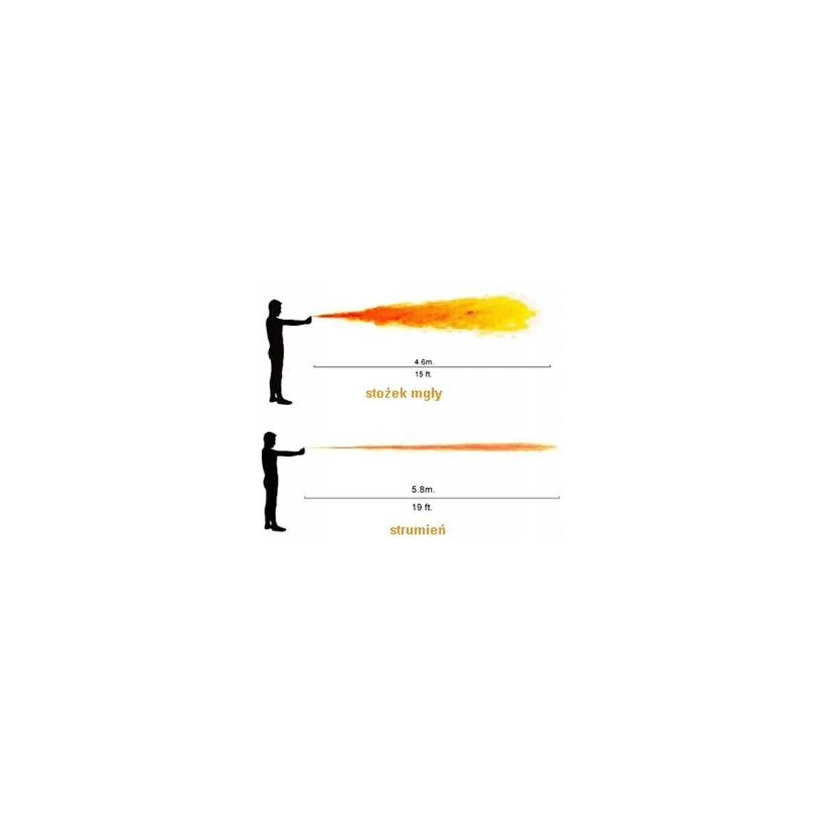 - Gaz pieprzowy o pojemności 340 ml rozpylany jest w formie stożka.
