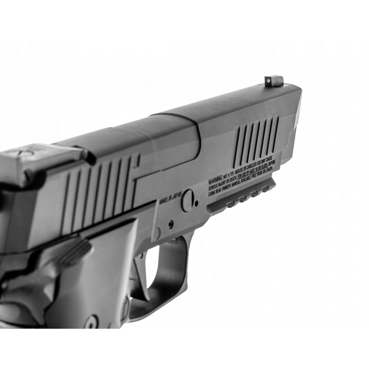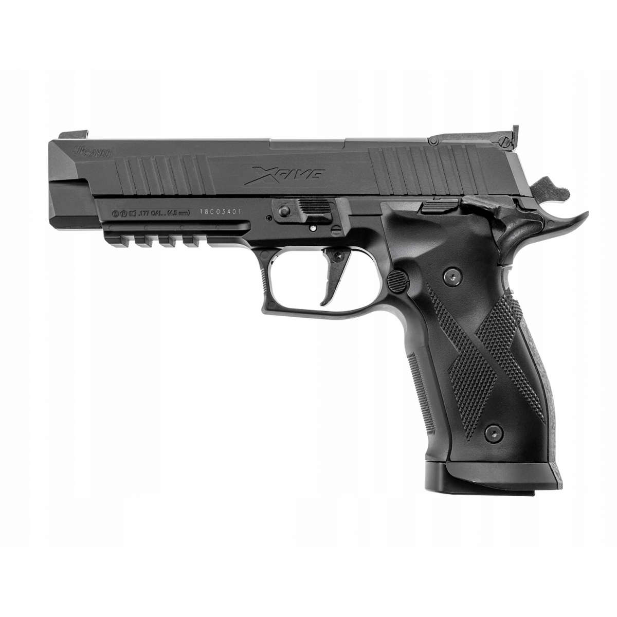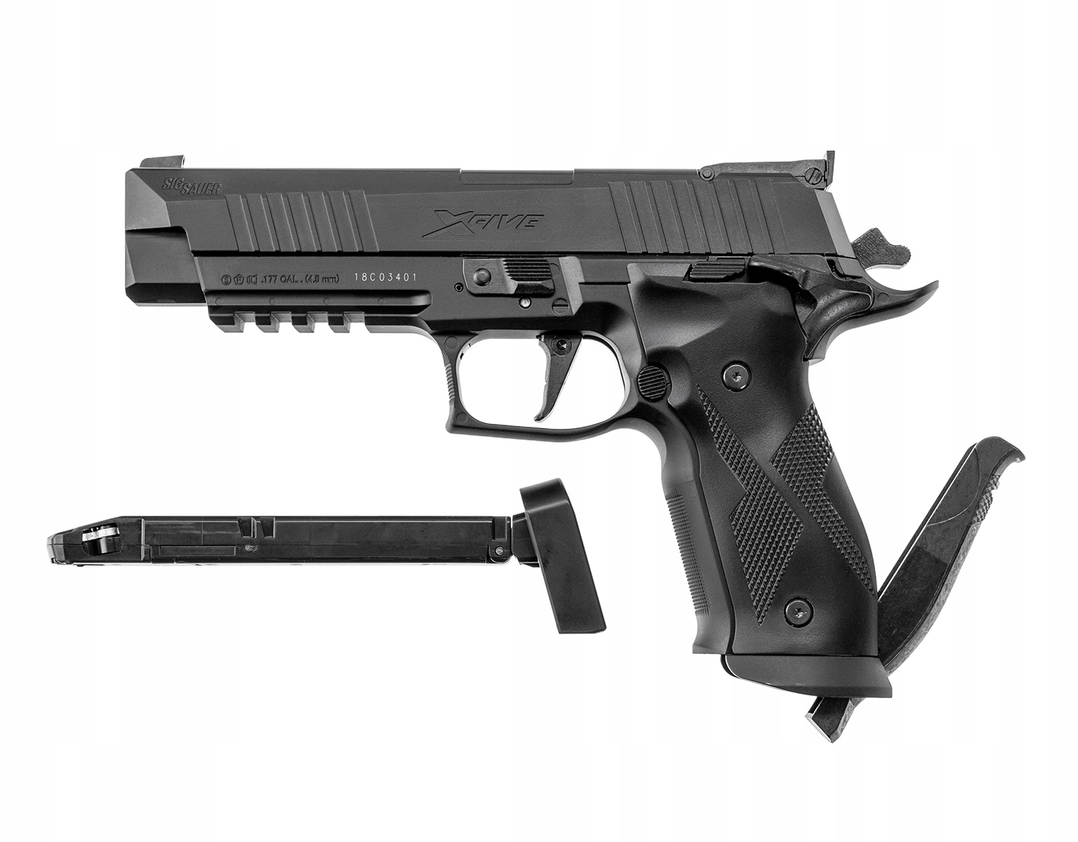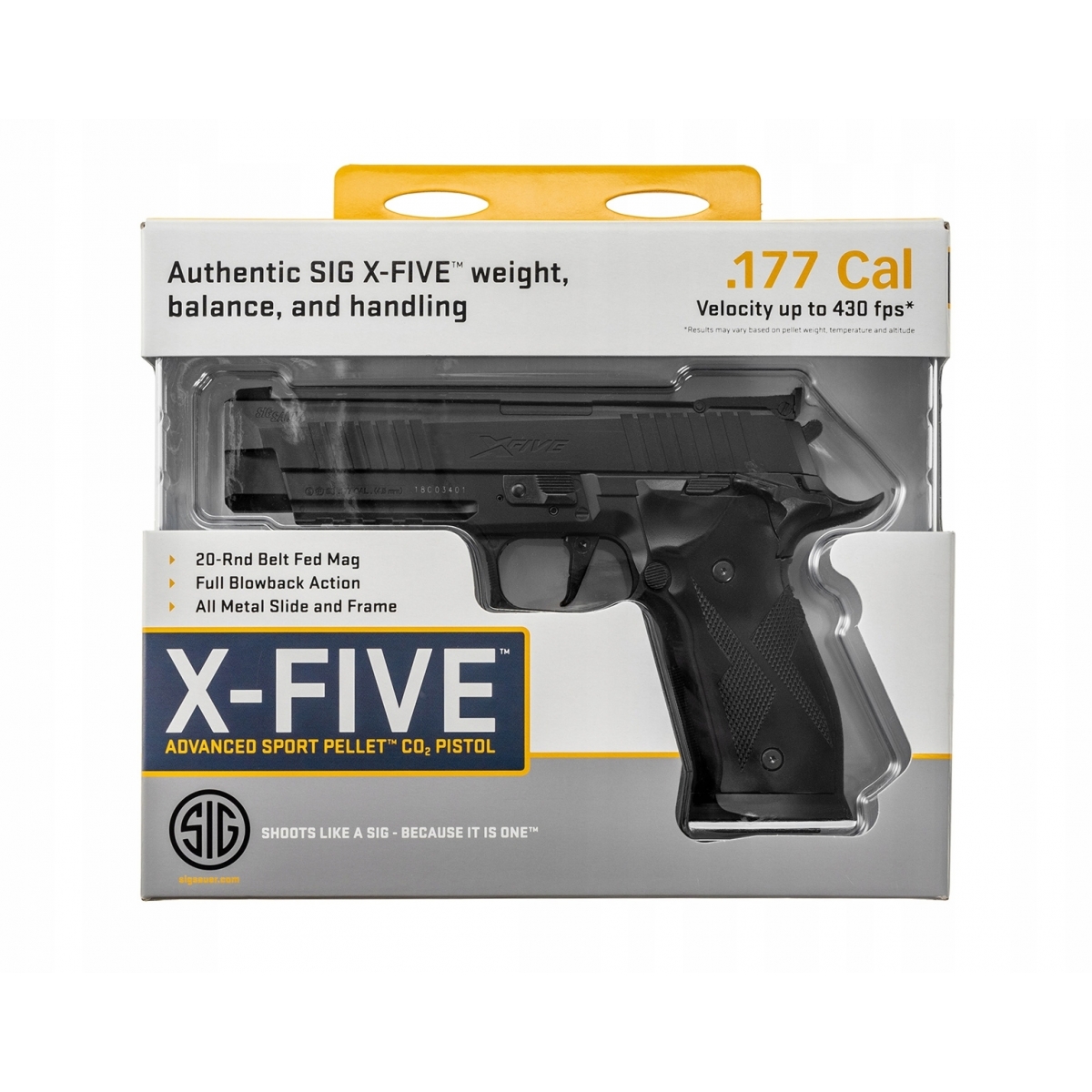 Wiatrówka Sig Sauer P226 X-Five 4,5 mm - zasilana 12g nabojem CO2 umieszczanym w rękojeści, strzela śrutem grzybkowym o kalibrze 4,5 mm. Wykonana niemal w całości z metalu, w magazynku mieści się 20 śrucin diabolo 4,5mm. Na pistolet oraz magazynek naniesione zostały licencjonowane oznaczenia Sig Sauer. Pistolet wyposażony został w system odrzutu zamka - blow back. Zapewnia on silny i odczuwalny odrzut pistoletu, podczas oddania każdego strzału, przez co ma bardziej realne odwzorowanie.