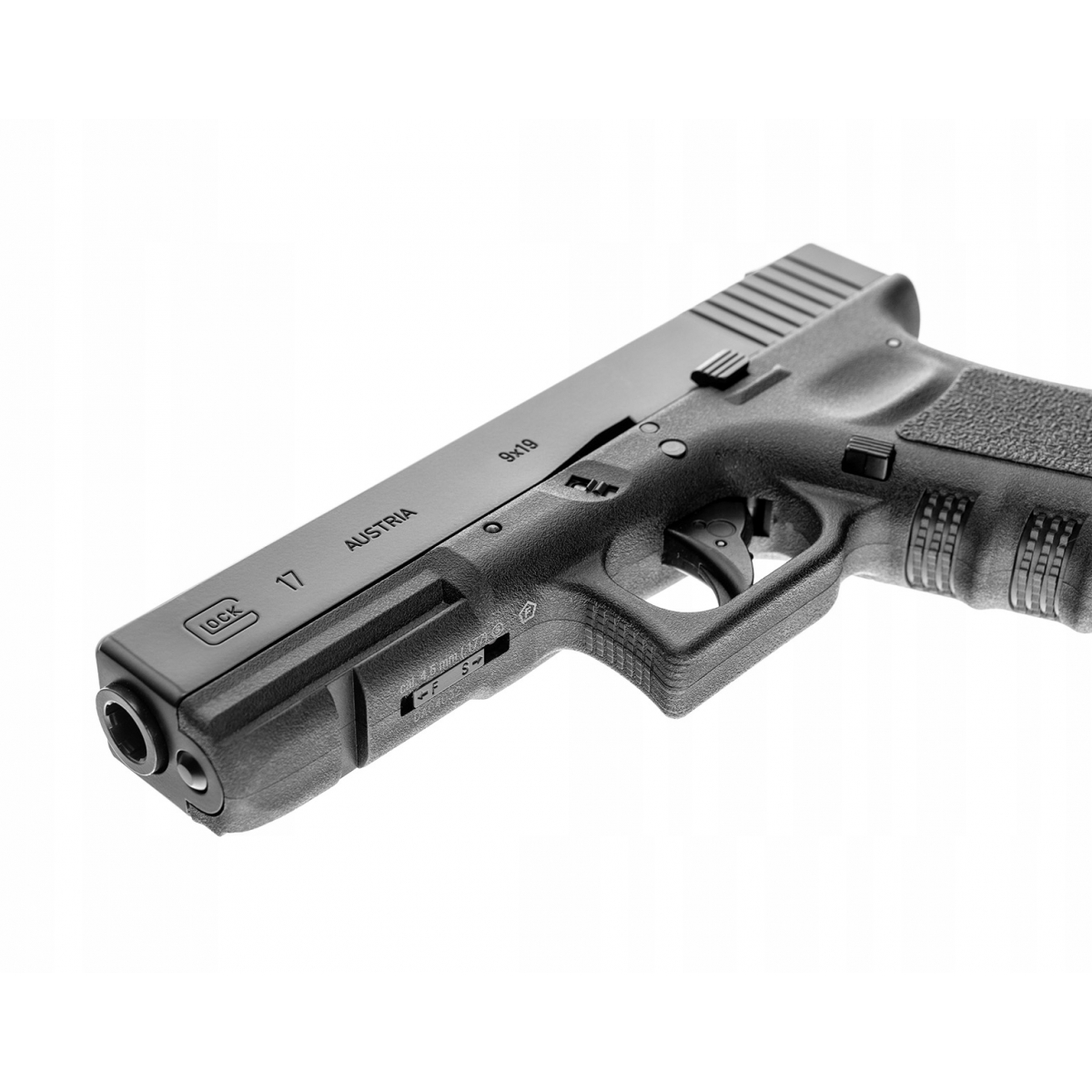 Wiatrówka Pistolet Glock 17 4,5 mm - to replika jednego z najbardziej rozpoznawalnych pistoletów na świecie. Zasilana za pomocą kapsuły 12g CO2, wyposażona została w magazynek na 18 sztuk śrutu kulistego typu BB 4,46mm. Pistolet został wyposażony w system odrzutu zamka Blow Back. Po wystrzeleniu ostatniego śrutu zamek pozostaje w tylnym położeniu.