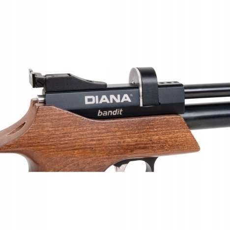 Wiatrówka Diana PCP Bandit 4,5 mm to bezodrzutowy pistolet PCP, wyposażony w gwintowaną lufę o długości 229 mm oraz miękki spust, co wpływa na celność i powtarzalność strzałów. Posiada obrotowy, aluminiowy magazynek o pojemności 9 śrutów oraz magnetyczną wkładkę jednostrzałową. Wykonana z olejowanego drewna bukowego.