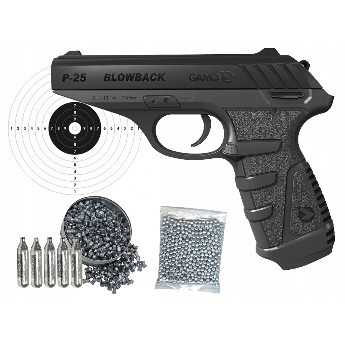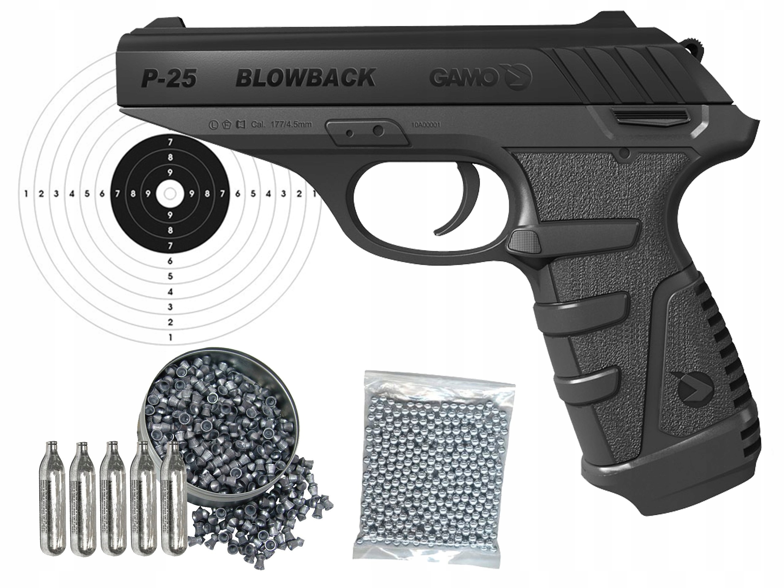 W zestawie: wiatrówka Gamo P-25 + opakowanie 250 szt śrutu 4,5mm + 250szt śrutu BB + 5 nabojów CO2 + 20 szt tarcz
