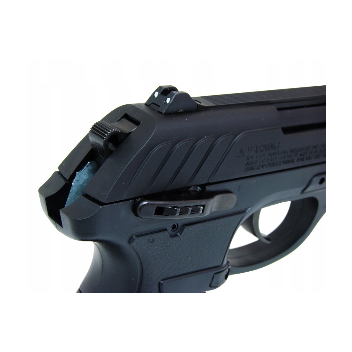- Spust jest blokowany nastawnym bezpiecznikiem, którego dźwignia znajduje się nad chwytem po prawie stronie pistoletu.