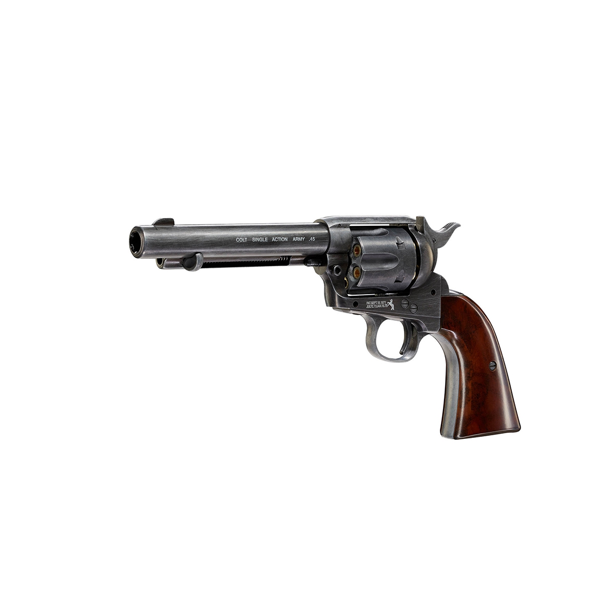 Wiatrówka rewolwer Colt Peacemaker Single Action Army .45 Antique to metalowa wierna replika wykonana przez niemiecką firmę Umarex. Wersja ta charakteryzuje się lufą o długości 5,5". Wiatrówka zasilana za pomocą 12g kapsuły CO2, która wystarcza na oddanie około 50-60 strzałów. Śrut diabolo 4,5mm wkłada się do łusek, które następnie pojedynczo ładuje się do 6-cio strzałowego bębna co dodaje realizmu. Rewolwer strzela tylko w trybie Single Action, czyli przez ręczne naciągnięcie kurka. Przed niekontrolowanym oddaniem strzału chroni blokada. Pistolet wykonany została z postarzanego metalu.