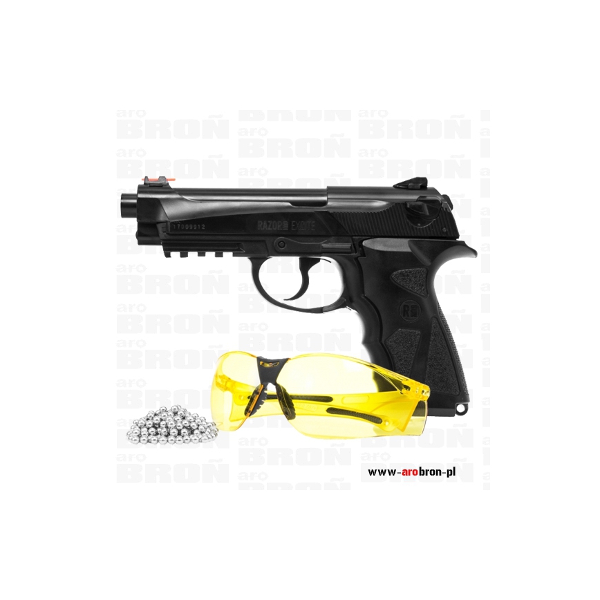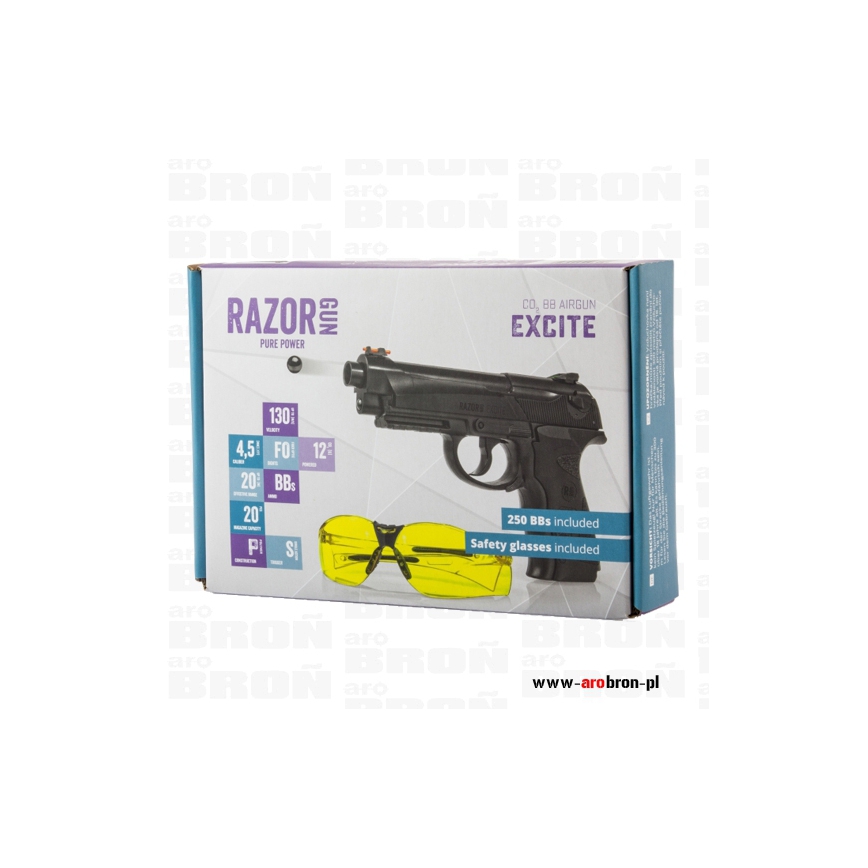 Pistolet wiatrówka RazorGun Excite 4,5mm wizualnie nawiązuje do modelu broni palnej Beretty 90 TWO. Wykonany został w całości z trwałego, odpornego na urazy tworzywa ABS. Zasilany jest za pomocą 12g kapsuły CO2 montowanej w rękojeść, która starczy na oddanie 60 strzałów. Magazynek mieści 20 sztuk kulek BB o kalibrze 4,5mm. Dobrze wyprofilowana rękojeść posiada teksturowania zapewniające pewny chwyt. Wiatrówka oddaje strzały w trybie Double Action Only. Pistolet został wyposażony w stałą muszkę i szczerbinką ze światłowodami co ułatwia celowanie przy słabym oświetleniu. Pod lufą znajduje się szyna 22mm pozwalająca zamontować celownik laserowy czy latarkę. Przed niekontrolowanym oddanie strzału chroni bezpiecznik umieszczony nad spustem. W komplecie znajduje się 250 sztuk śrutu, okulary strzeleckie.