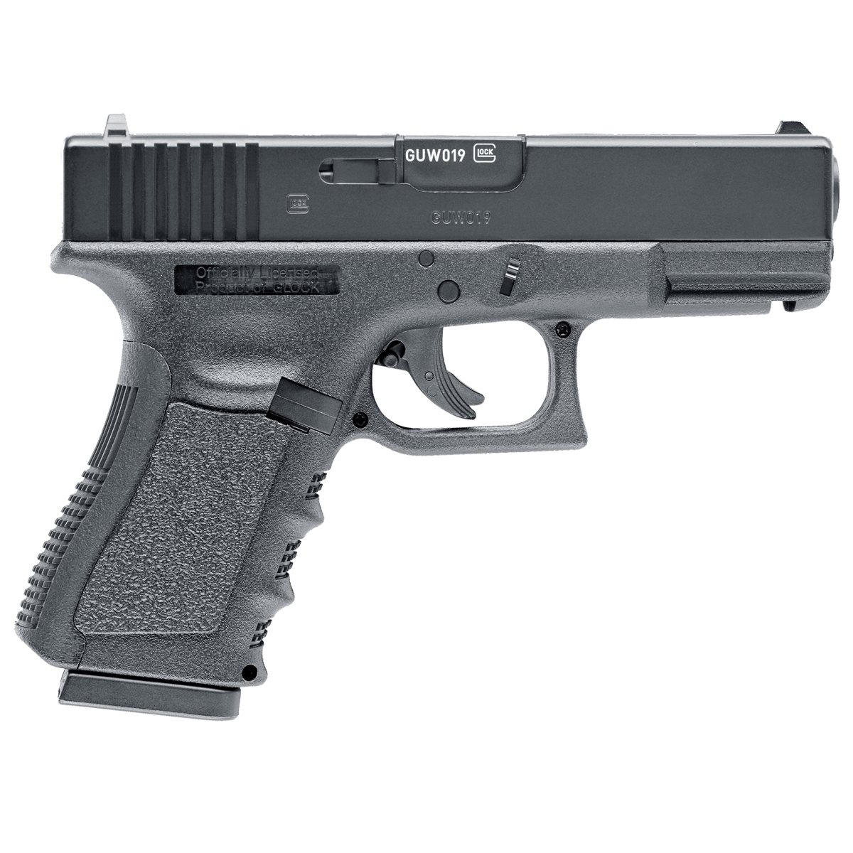 Wiatrówka Pistolet Glock 19 4,5 mm - to długo wyczekiwana replika jednego z najbardziej rozpoznawalnych pistoletów na świecie. Zasilana za pomocą kapsuły 12g CO2, wyposażona została w magazynek na 16 sztuk śrutu kulistego typu BB 4,46mm. Prędkość wystrzelonego śrutu sięga około 130 m/s. Lufę wykonano z metalu, natomiast korpus z wytrzymałego tworzywa sztucznego. Rękojeść posiada antypoślizgową fakturę, która zapewnia pewny chwyt. Wiatrówka została wyposażona w stałe przyrządy celownicze: muszkę i szczerbinkę. Pistolet posiada oryginalne licencjonowane oznaczenia.
