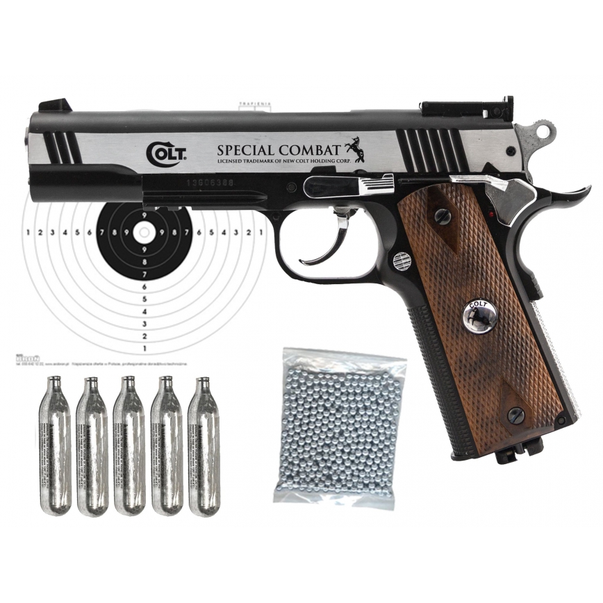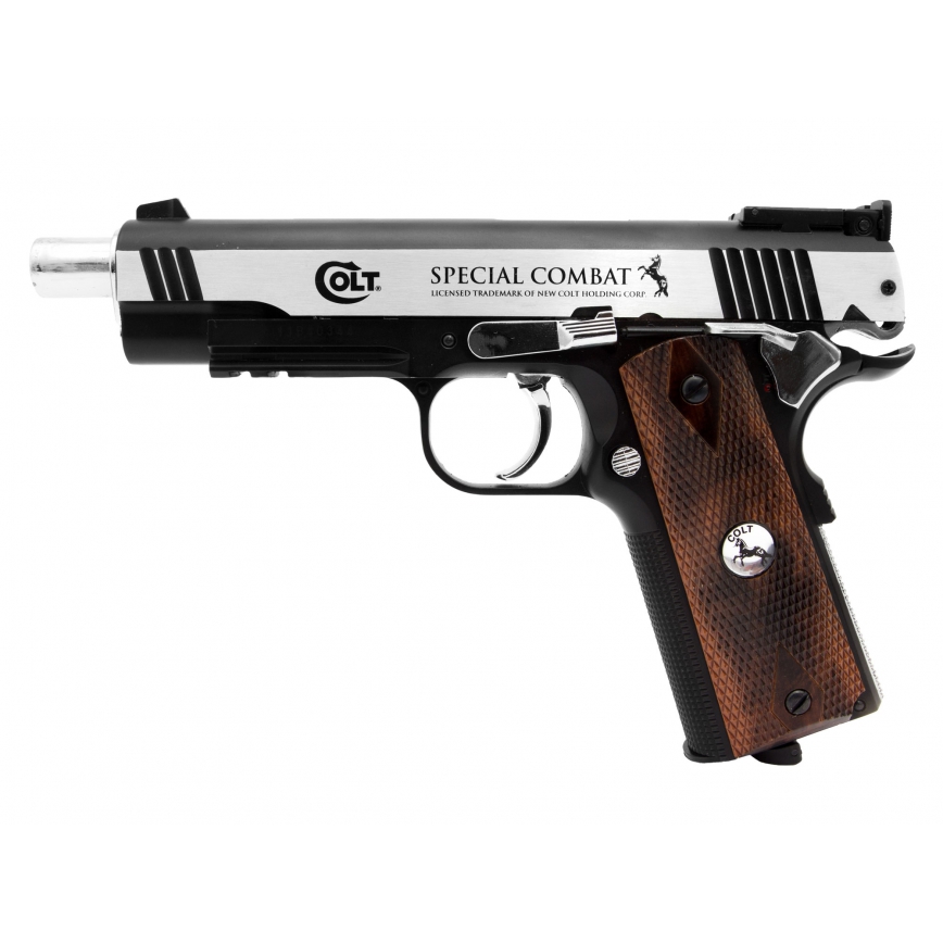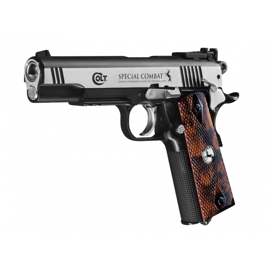Wiatrówka Colt Special Combat Classic - nowa, oryginalna replika z ruchomym zamkiem oraz magazynkiem w rękojeści. Wersja special combat classic posiada metalowy zamek oraz okładki z tworzywa imitującego drewno.