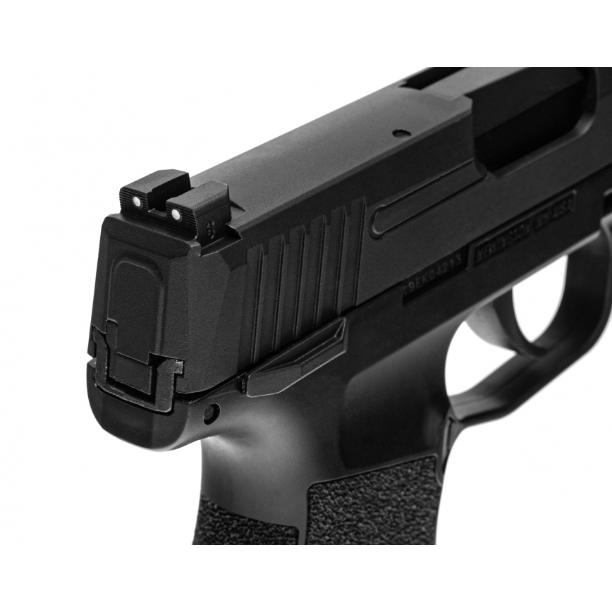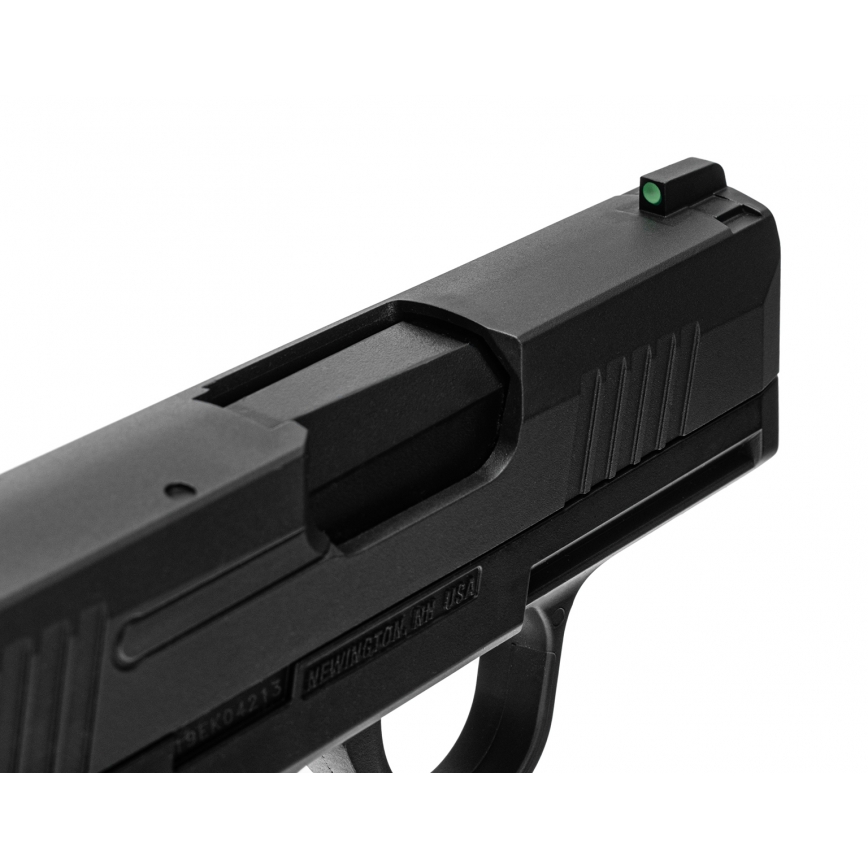 Wiatrówka Sig Sauer P365 4,5 mm to licencjonowana replika broni amerykańskiego producenta. Wykonana tak jak w oryginale palnym z metalu i mocnego tworzywa sztucznego. Wiatrówka zasilana za pomocą kapsuły CO2 12g. Model został wyposażony w magazynek na 20 szt. śrutu diabolo. Mechanizm spustowy pracuje w trybie single action only czyli przed oddaniem strzału należy naciągnąć zamek. Metalowy zamek został wyposażony w system odrzutu blowback, co nadaje realizmu. Szyna RIS 22mm znajdująca się pod lufą pozwala na zamontowanie dodatkowych akcesoriów typu latarka czy celownik laserowy. Przed niekontrolowanym oddaniem strzału chroni blokada spustu umieszczona po obu stronach korpusu. Dodatkowym atutem wiatrówki są oznaczenia bojowe producenta naniesione na metalowy zamek tak jak w oryginale palnym. Ten model posiada stałe przyrządy celownicze muszkę i szczerbinkę z naniesionymi na nie jasnymi oznaczeniami.