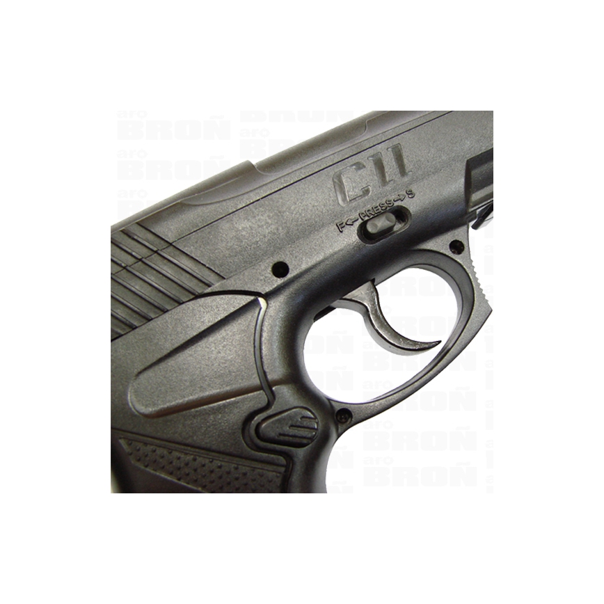 - Pistolet posiada uniwersalną szynę ( systemu RIS) na której możemy zamontować celownik laserowy lub latarkę operacyjną. C11 posiada również wysuwany magazynek mogący pomieścić 20 śrucin typu BB.