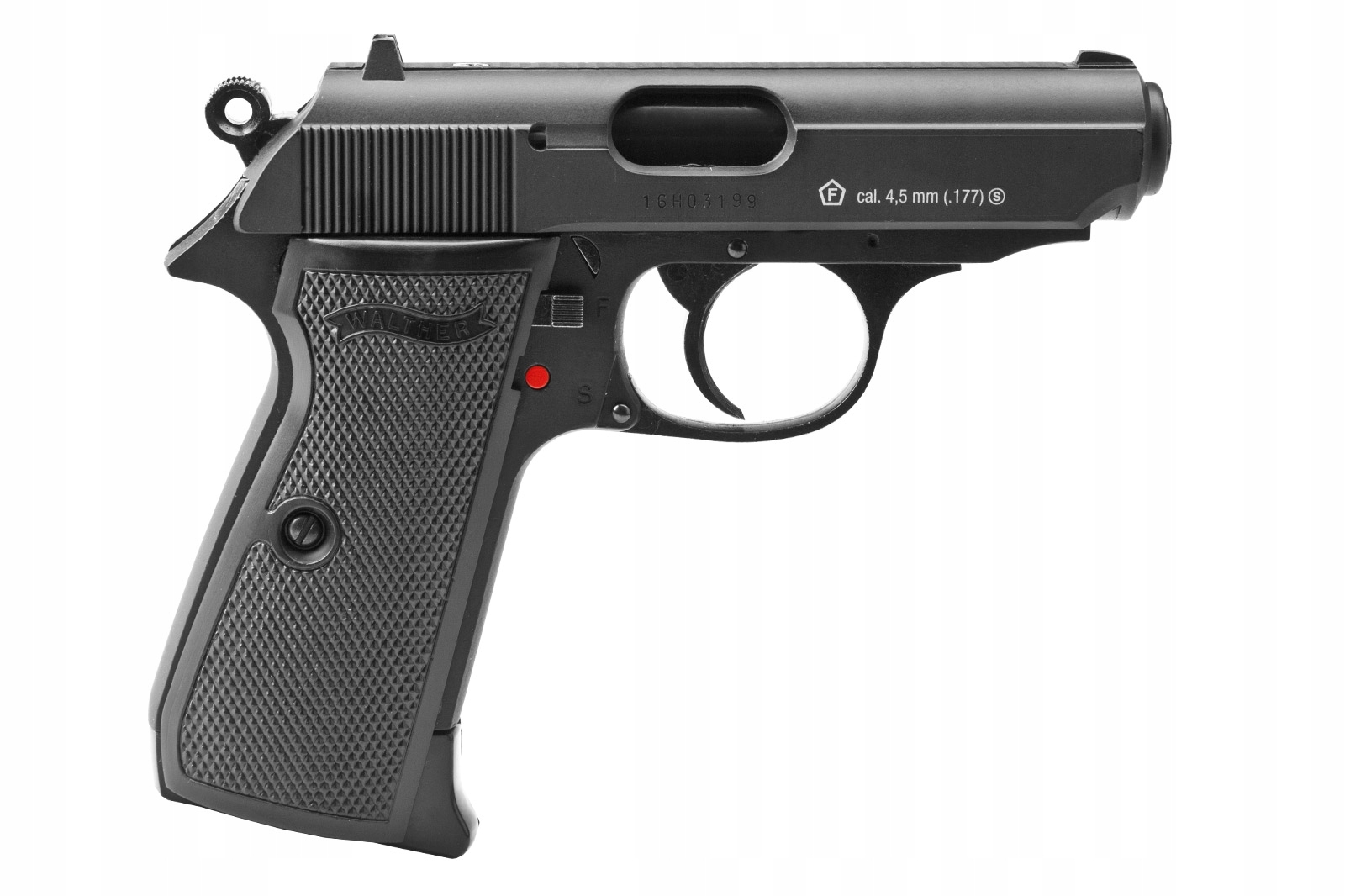 - Wiatrówka CO2 Walther PPK/s posiada bezpiecznik skrzydełkowy, chroniący przed oddaniem niekontrolowanego strzału.
