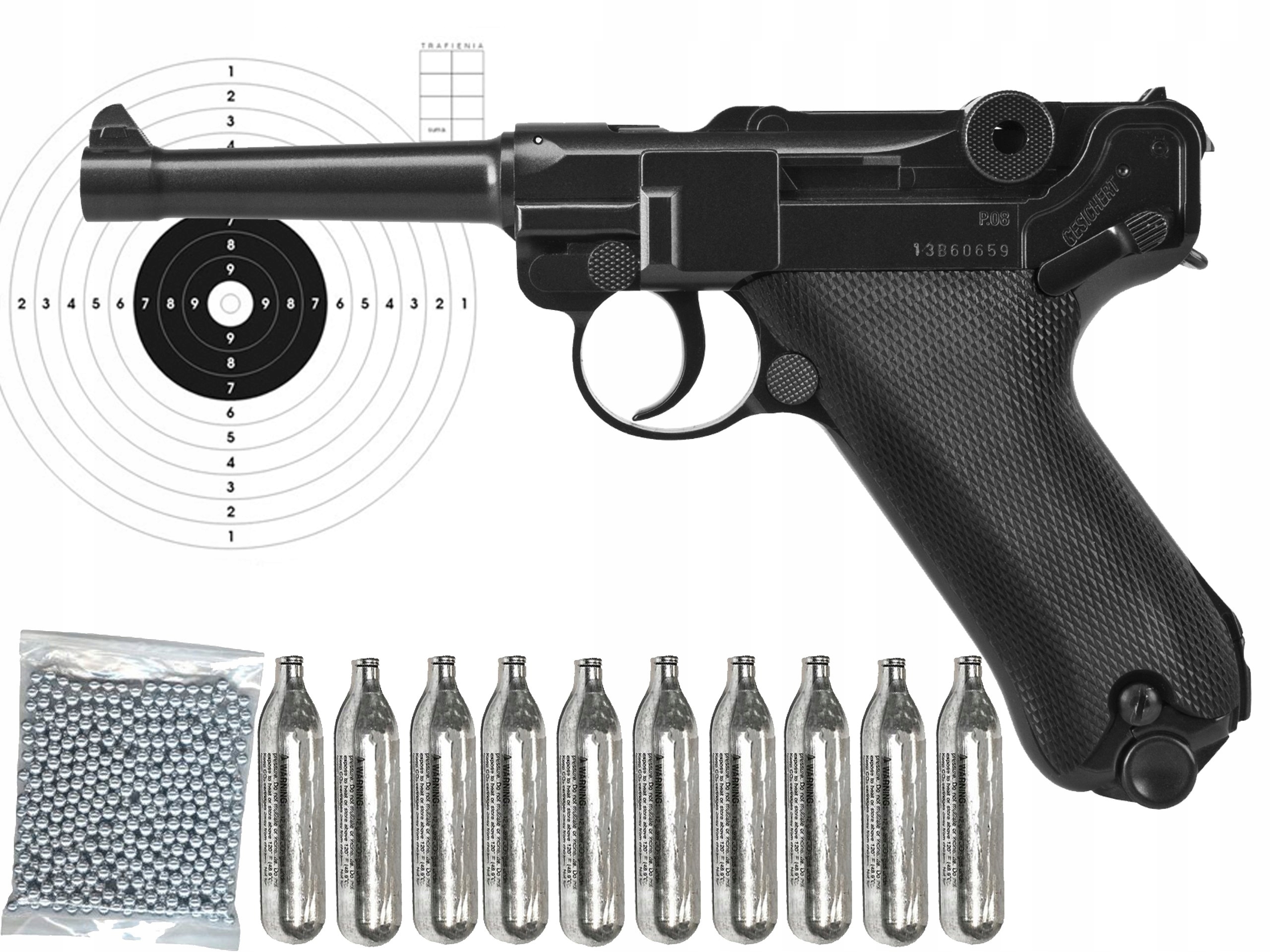 W zestawie: wiatrówka P08 blow back + 10 nabojów CO2 + 500 szt śrutu BB + 50 szt tarcz.