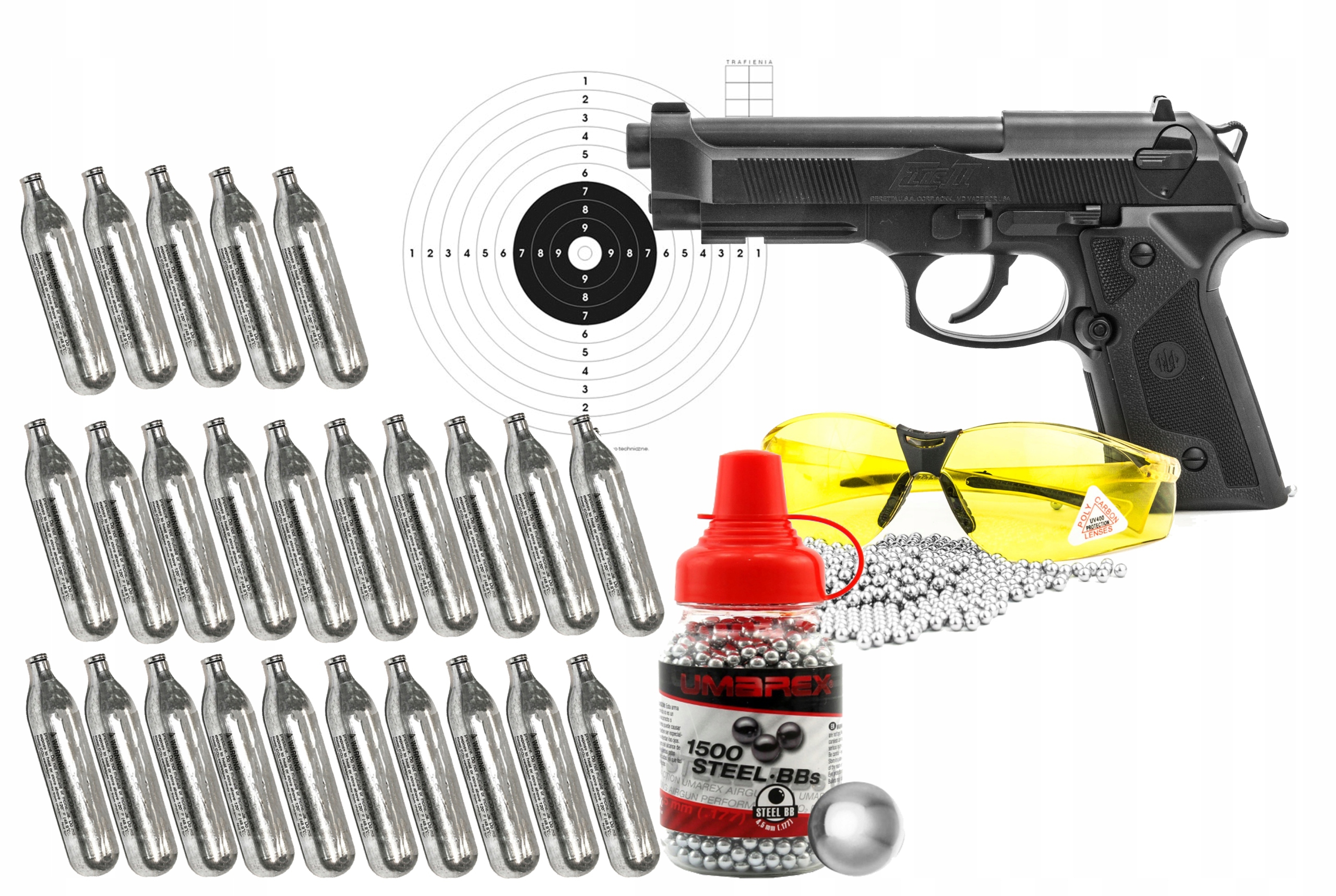 W zestawie: wiatrówka, okulary strzeleckie , 25szt nabojów Co2, 1750szt śrutu BB UMAREX, komplet 20szt solidnych, grubych tarcz.