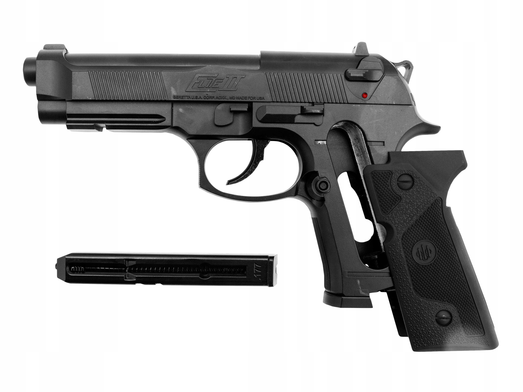 Wiatrówka Umarex BERETTA ELITE II ZESTAW - to pneumatyczna wersja pistoletu stworzonego specjalnie dla elitarnych oddziałów policji. Powstał dzięki ścisłej współpracy koncernów Umarex oraz Beretta - światowych liderów produkcji broni. Jest to jedna z najlepszych replik na CO2 w swojej klasie cenowej. Całość bardzo ładnie i solidnie wykonana, posiada trwałe, czarne pokrycie materiałem ABS.