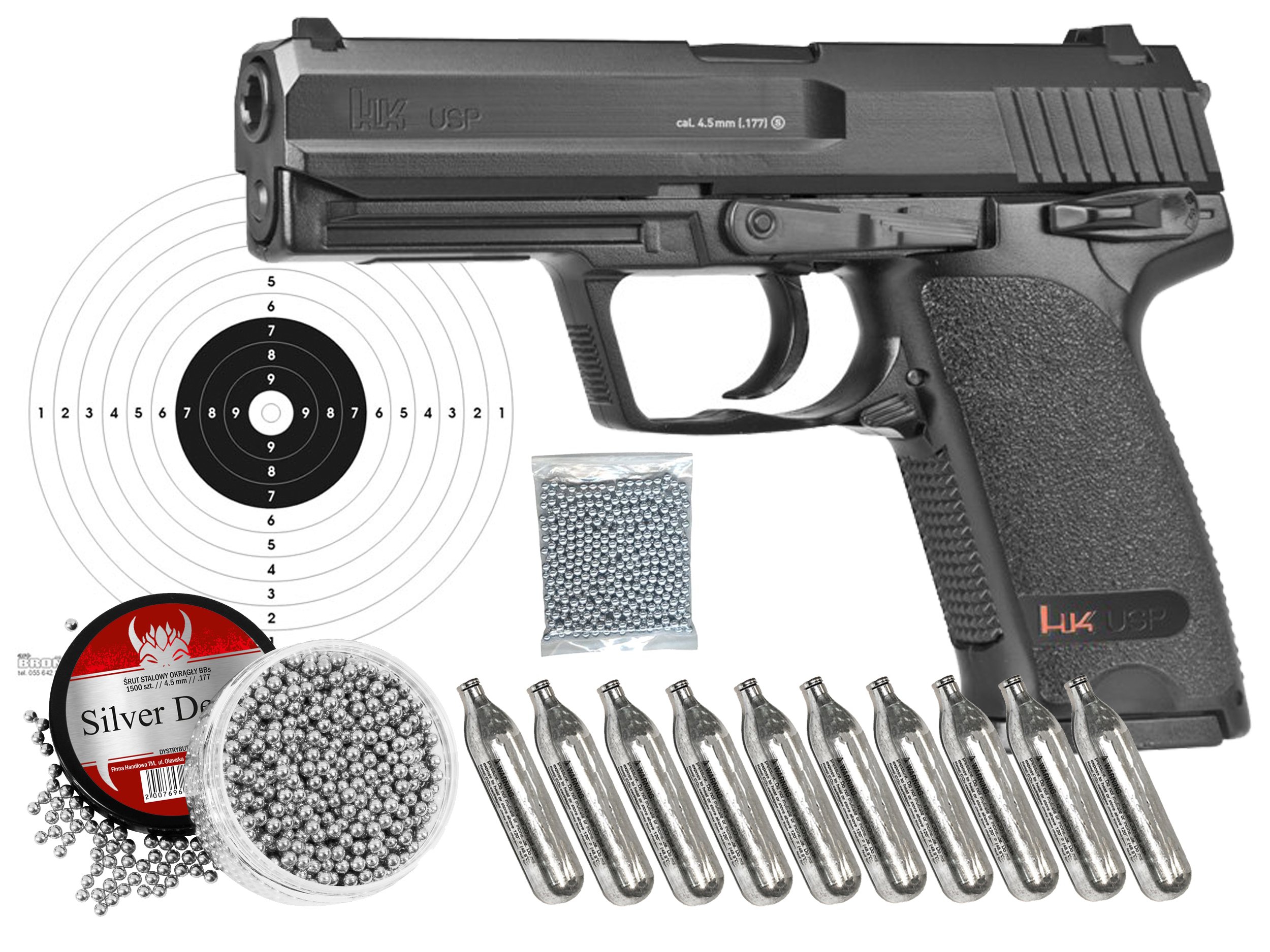 W zestawie: Wiatrówka USP, śrut BB 1750 szt, 10 szt nabojów Co2 i komplet 20 szt tarcz.
