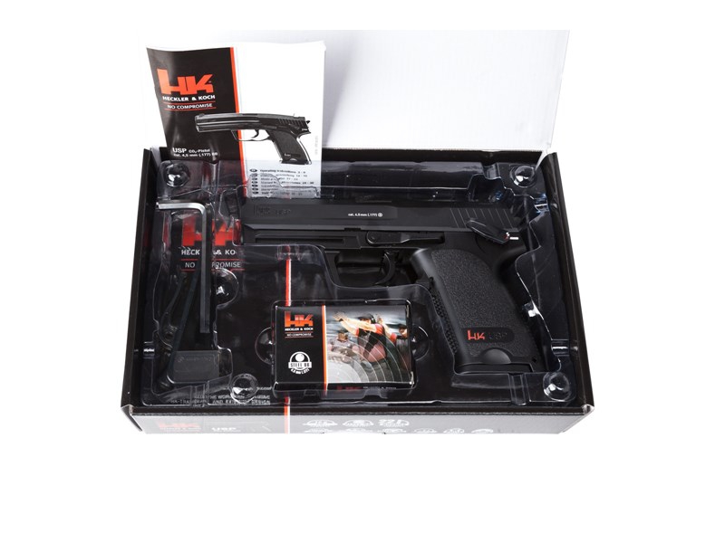 - Pneumatyczny pistolet HK USP ma pełnowymiarowy magazynek wsuwany do rękojeści, mieści się w nim zawór i 12-gramowa kapsuła CO2 oraz podajnik na 22 kulki stalowe 4,46 mm.